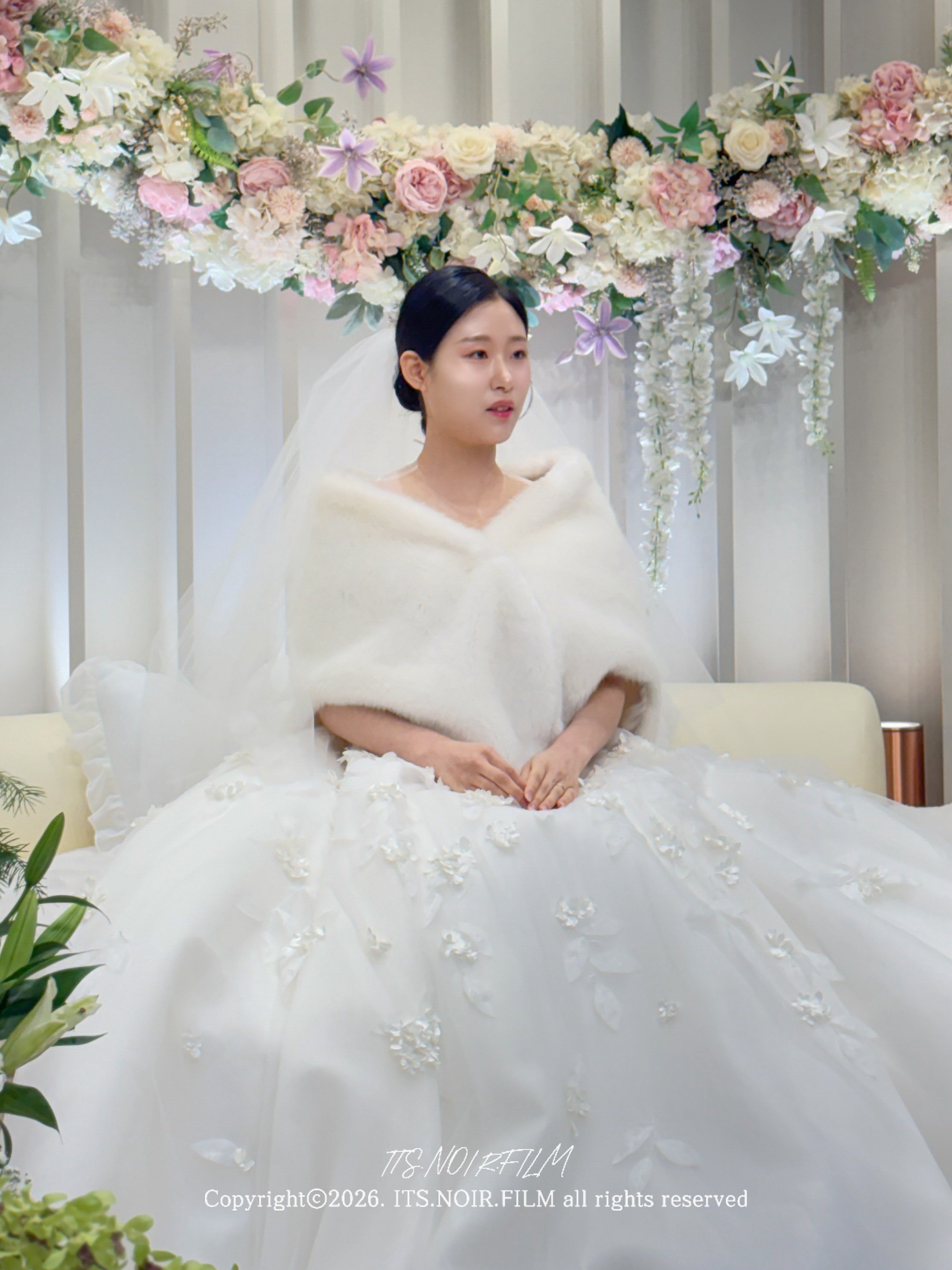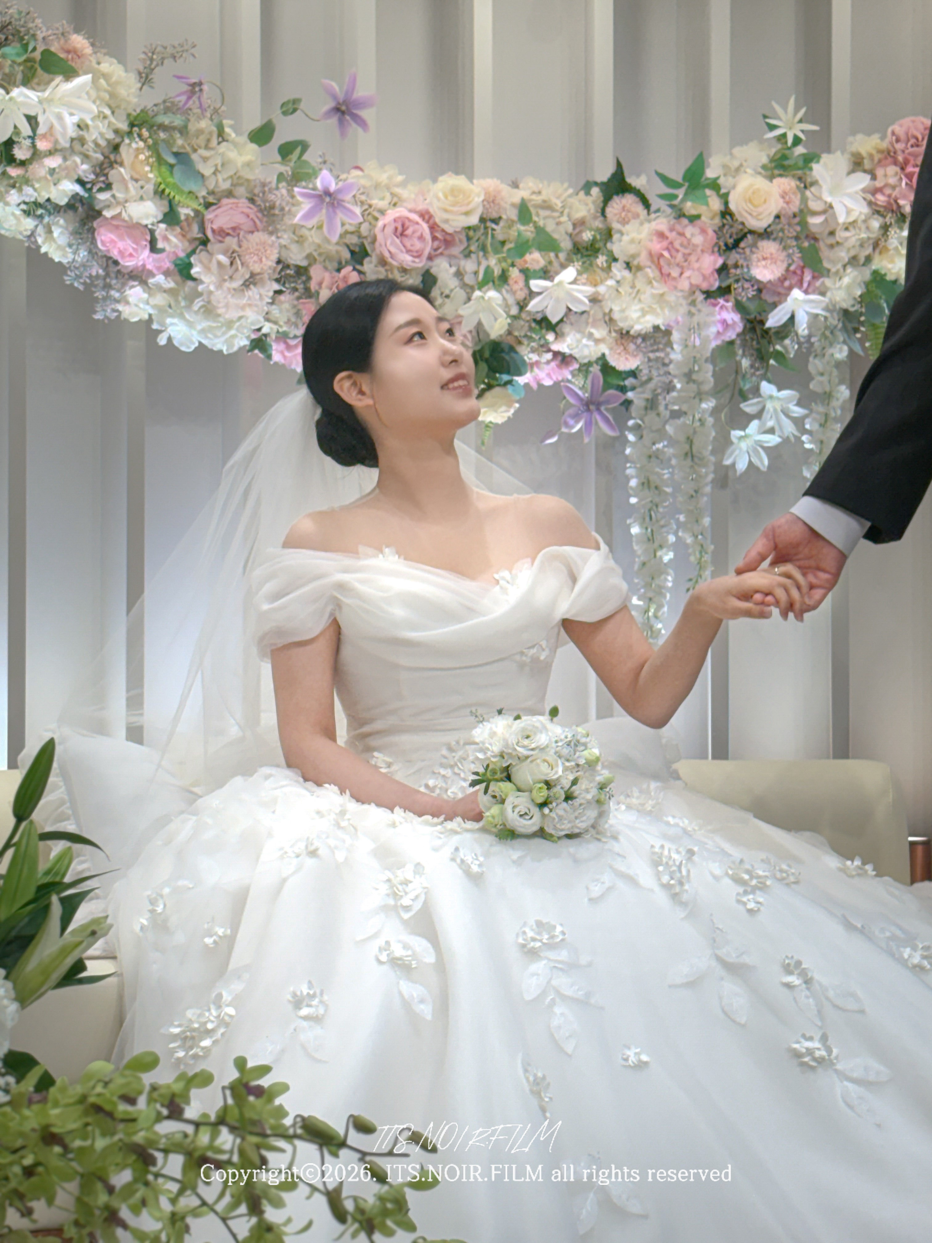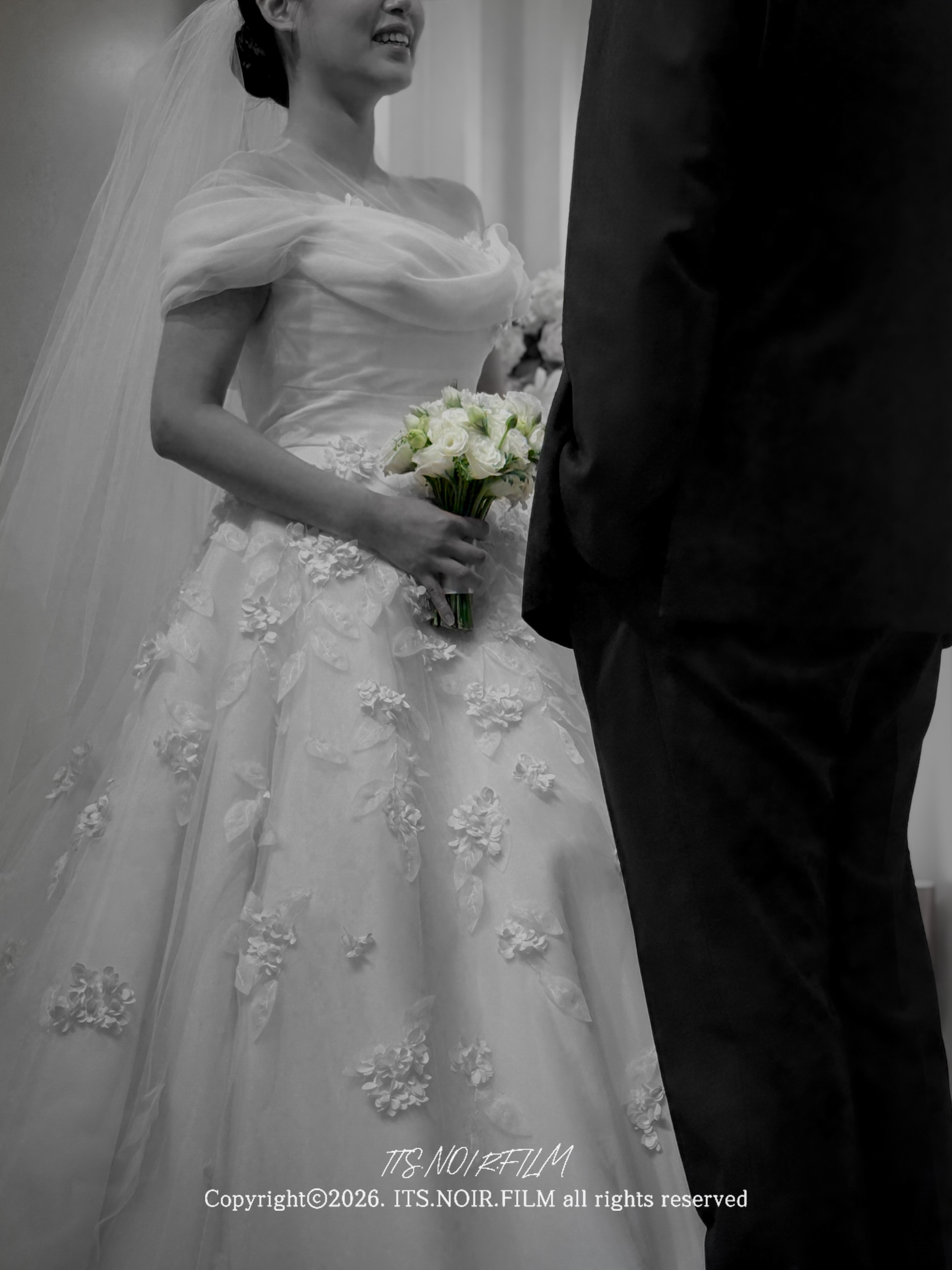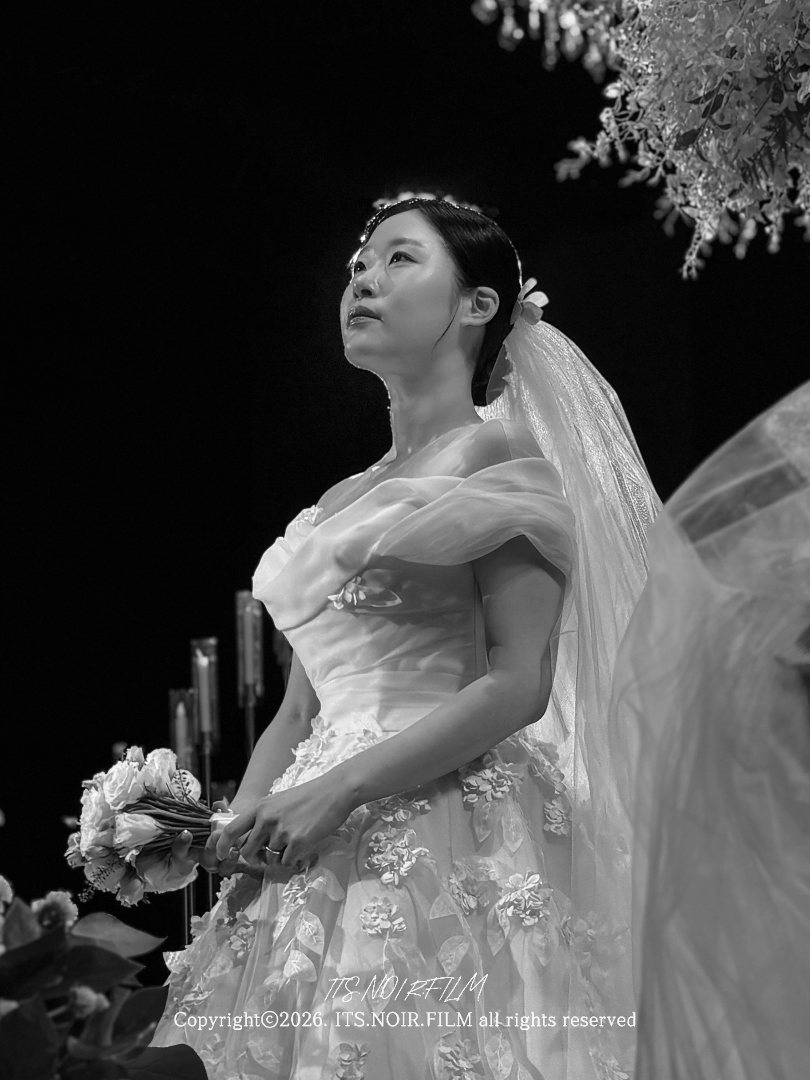 생화 장식과 어우러진 화사한 조명 덕분에 신부님의 피부 톤이 매우 깨끗하게 표현됩니다. 잇츠누아르필름은 신부님의 미소는 물론, 부토니에를 정돈하는 신랑님의 멋진 순간까지 놓치지 않고 앨범에 채워드립니다.