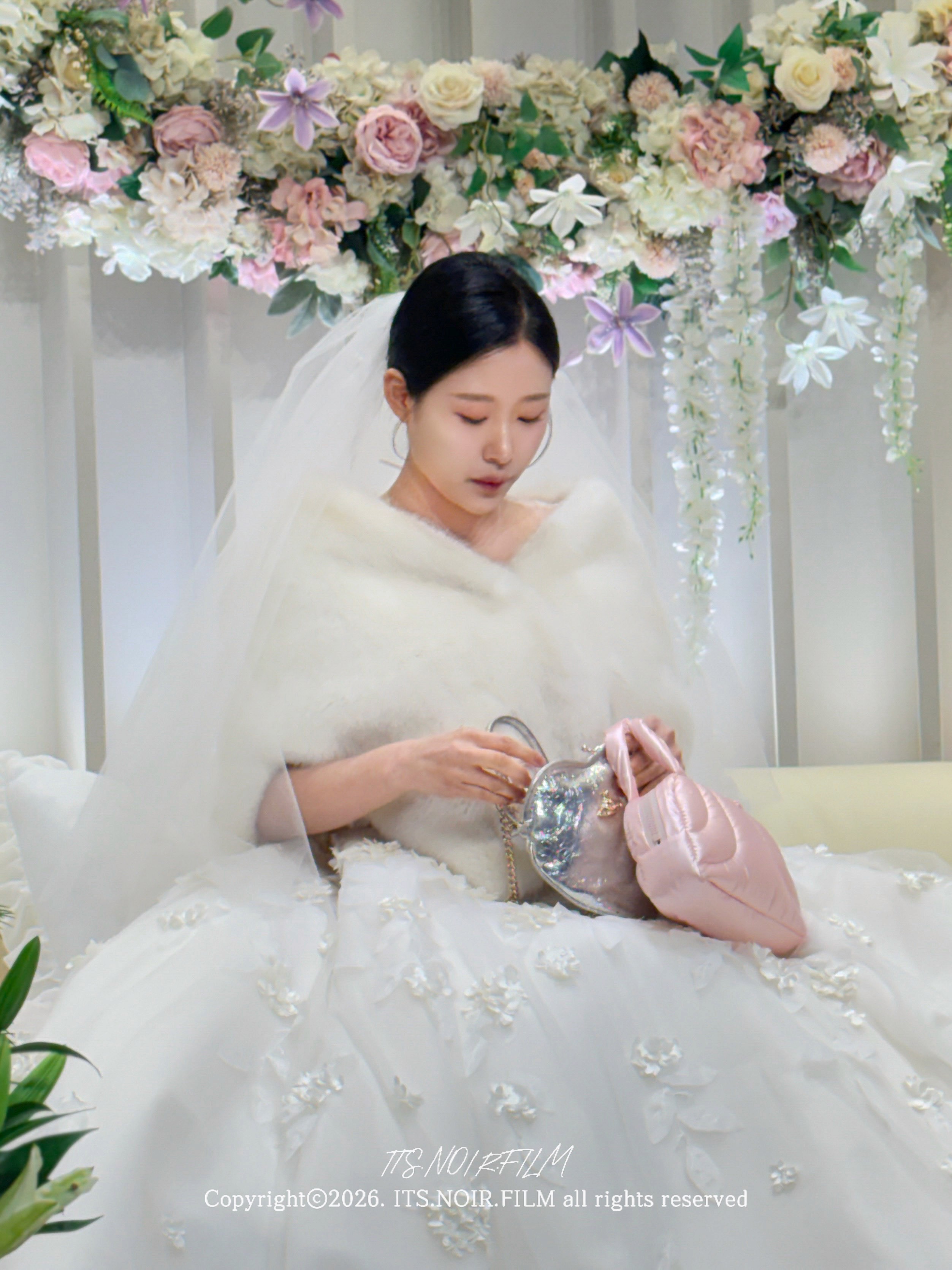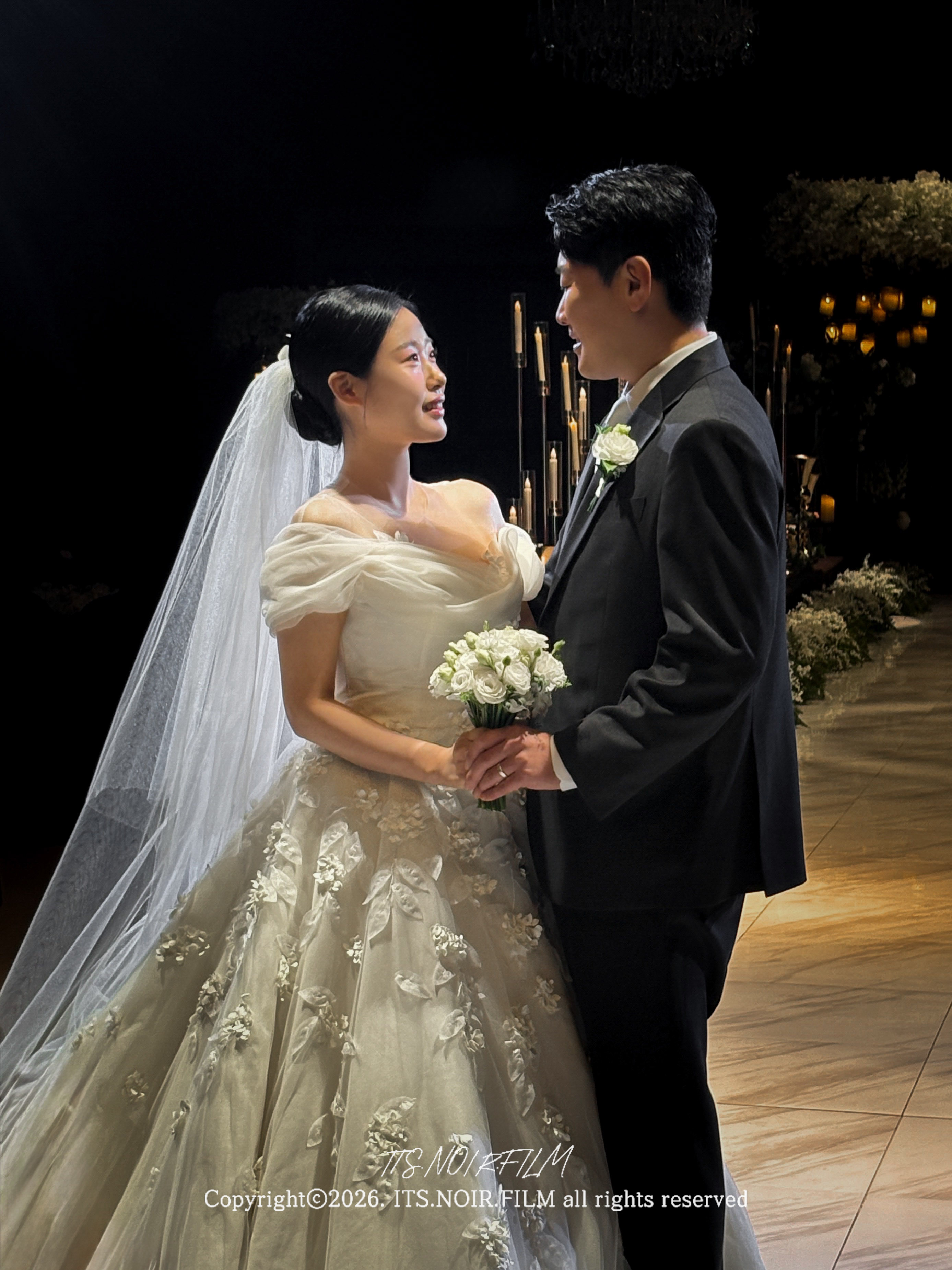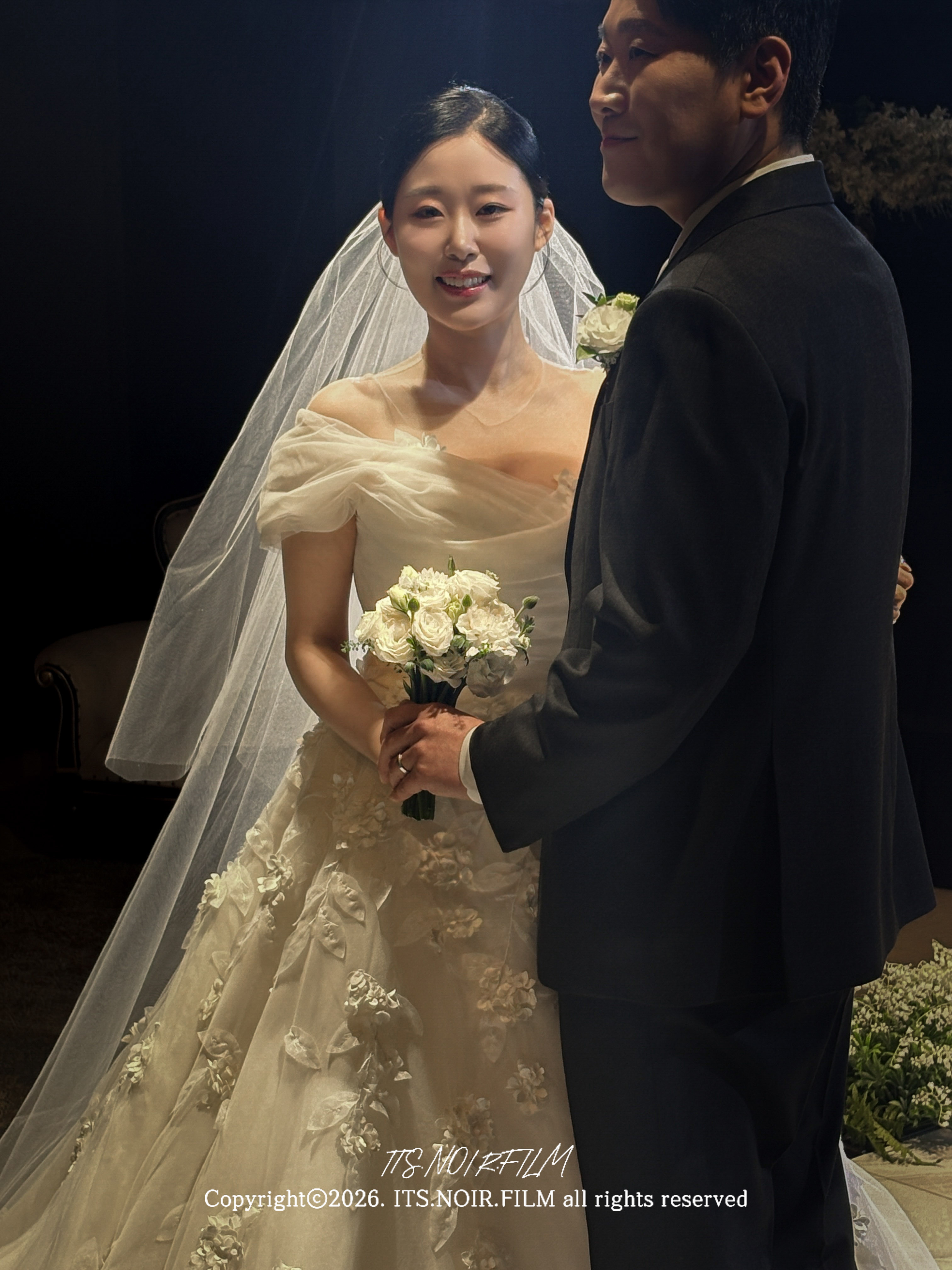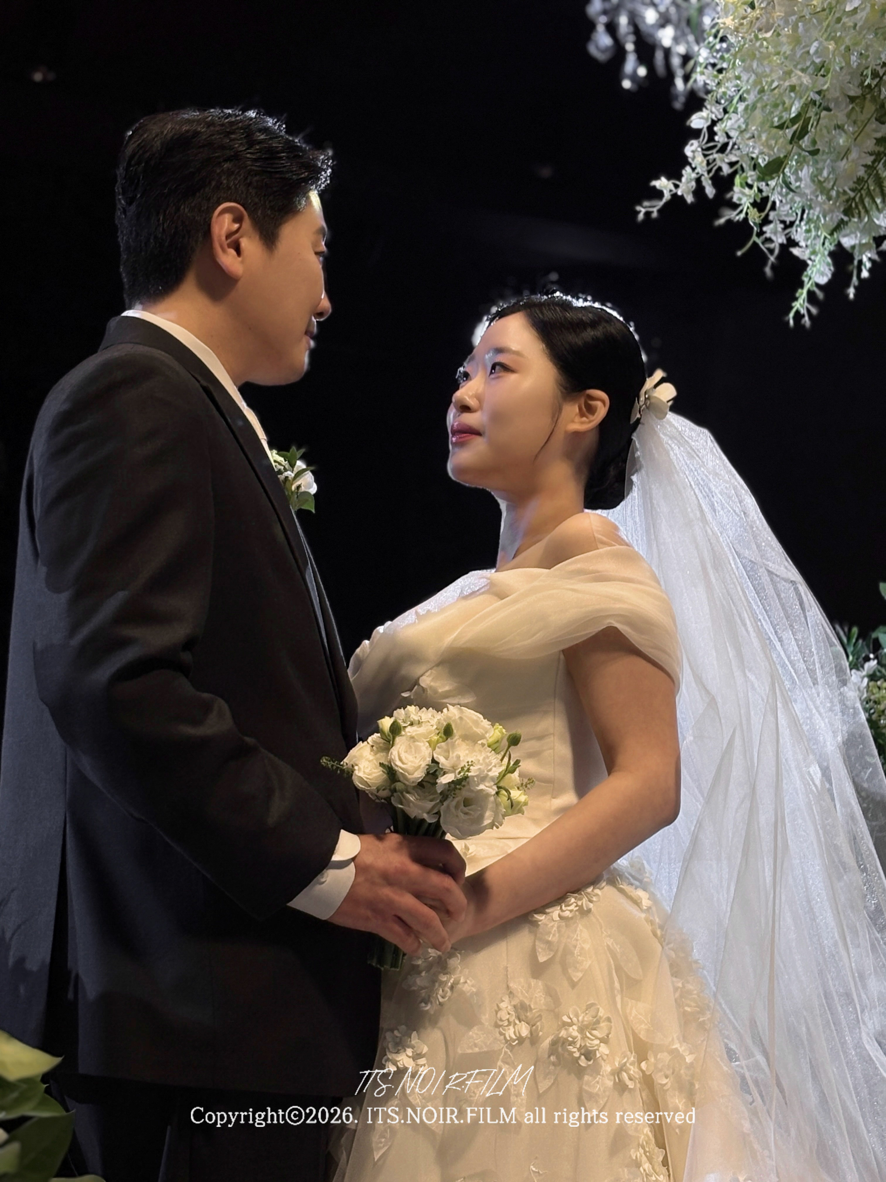 생화 장식과 어우러진 화사한 조명 덕분에 신부님의 피부 톤이 매우 깨끗하게 표현됩니다. 잇츠누아르필름은 신부님의 미소는 물론, 부토니에를 정돈하는 신랑님의 멋진 순간까지 놓치지 않고 앨범에 채워드립니다.