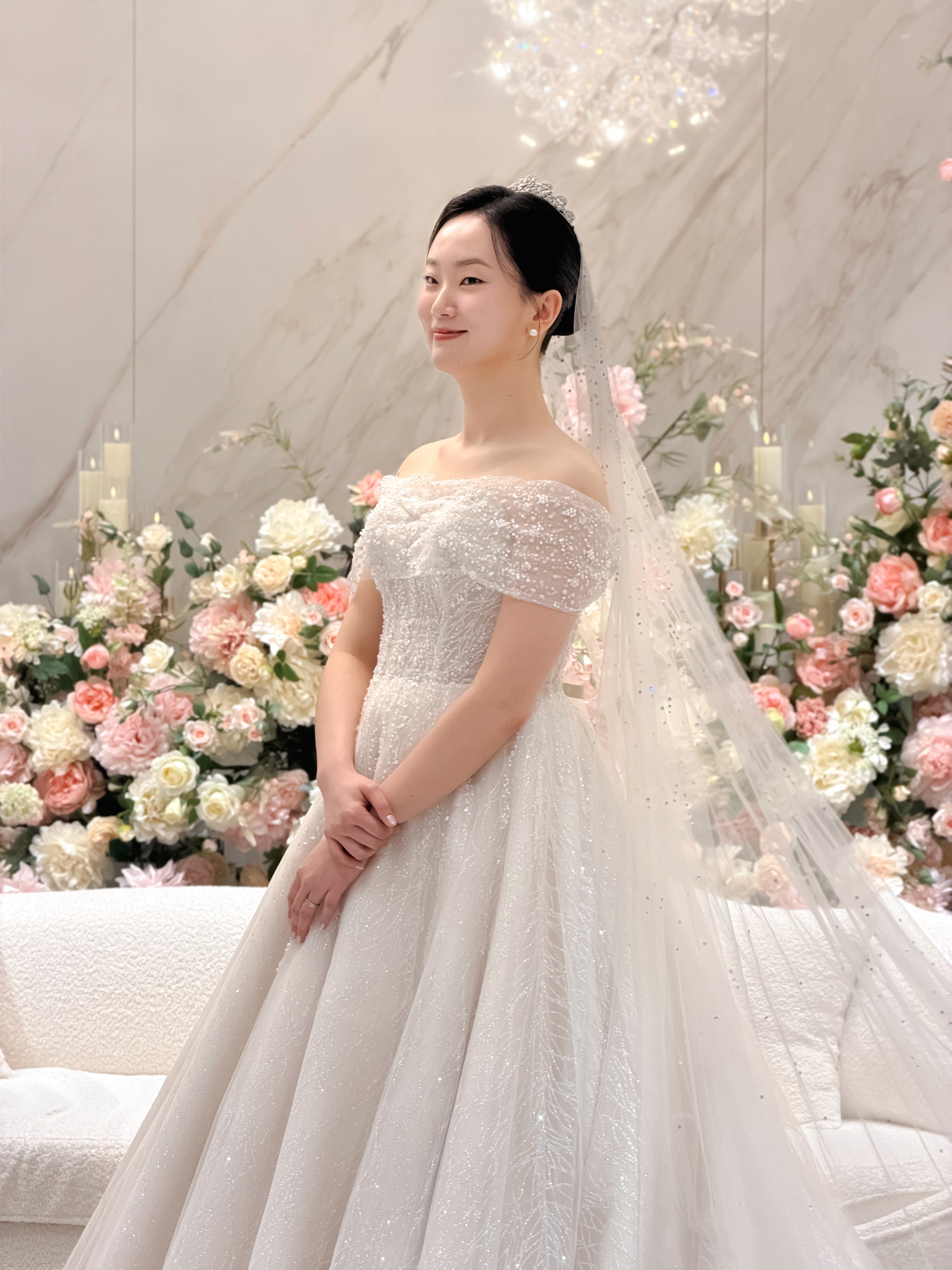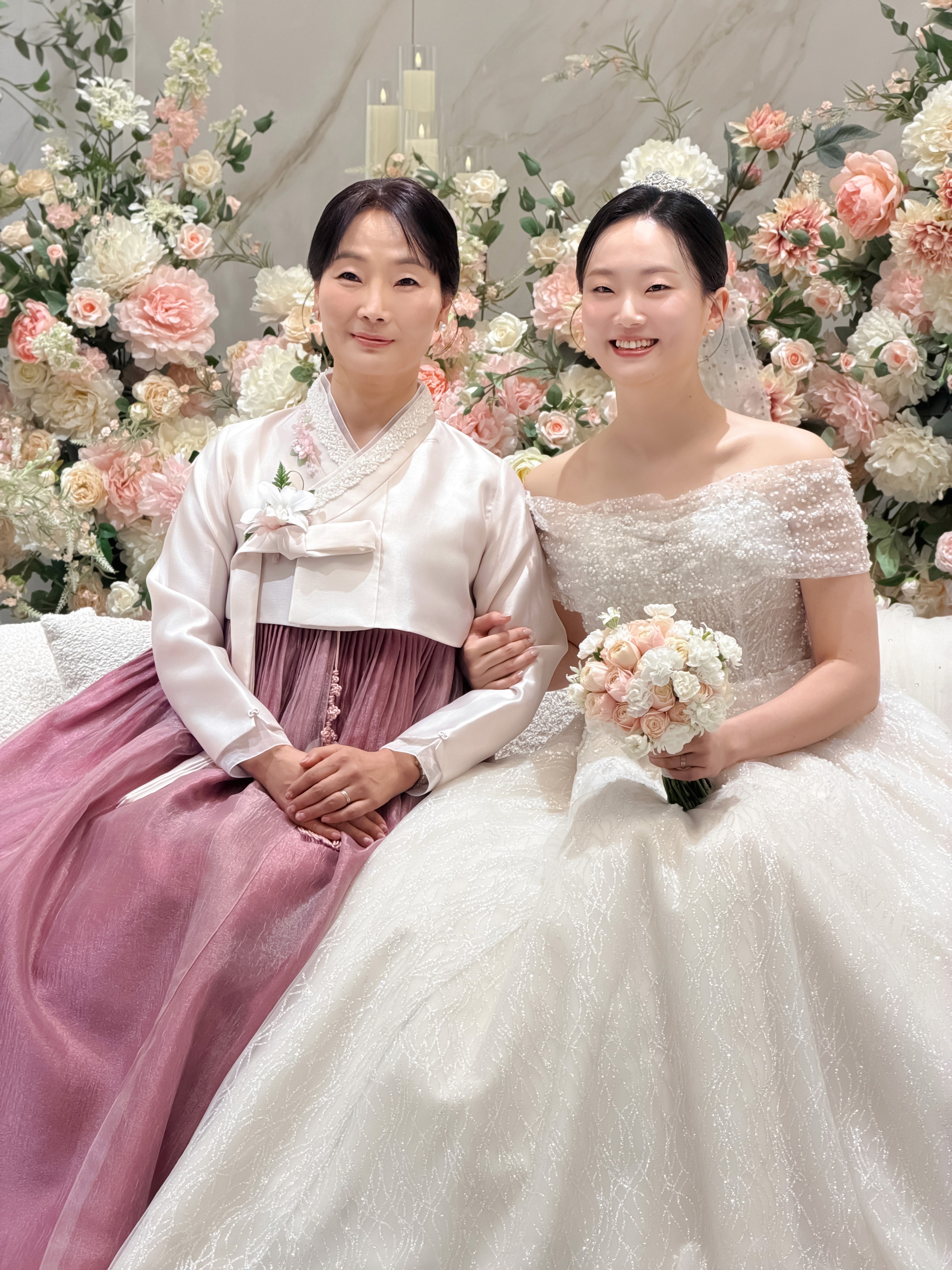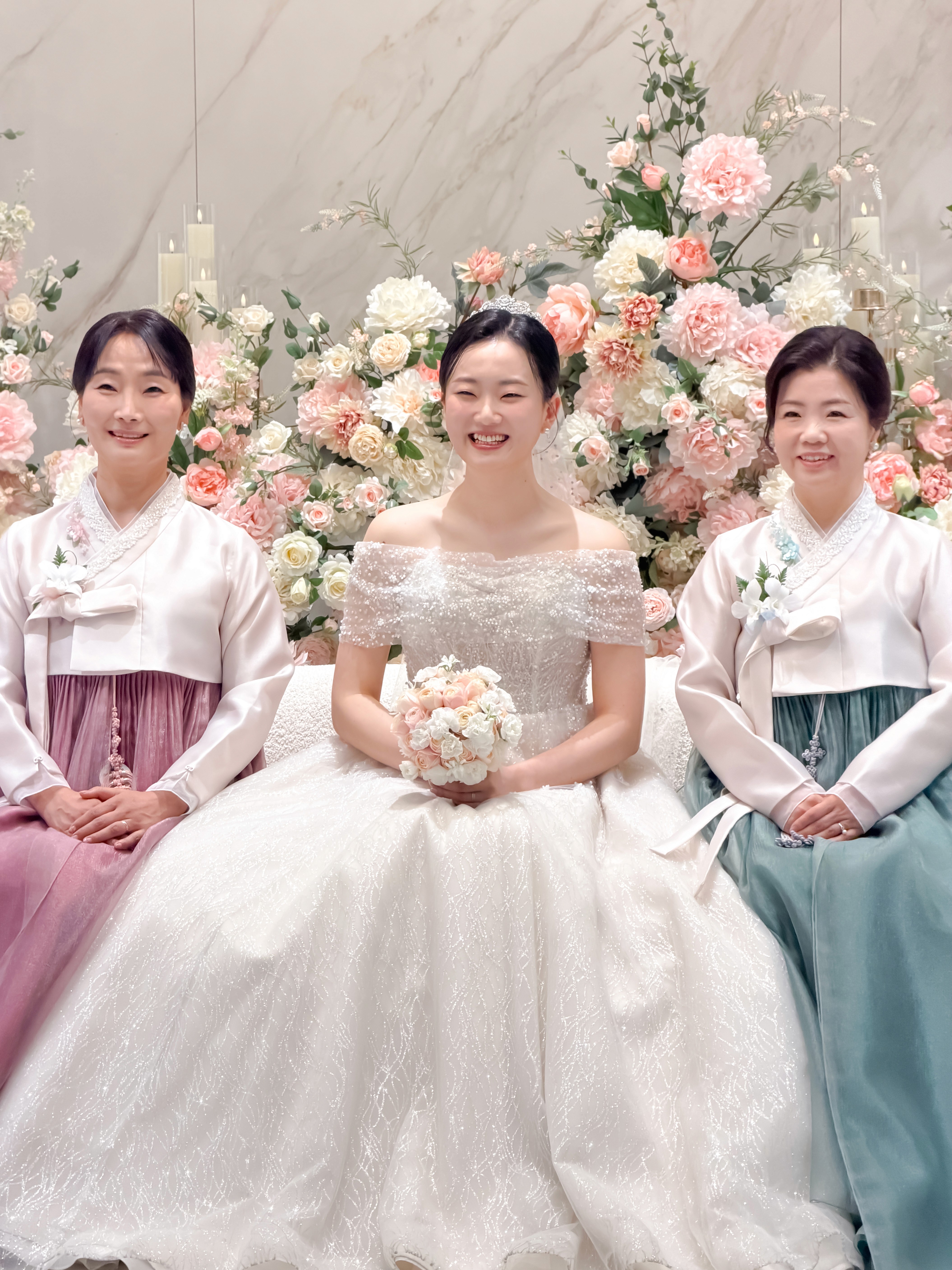 단차 있는 소파와 과하지 않게 세팅된 꽃장식은 신부님의 우아함을 방해하지 않으면서도 확실한 포인트가 되어줍니다. 또한 대기실 바로 앞에 포토테이블이 있어 하객분들의 즐거운 표정을 담기 좋고, 홀과의 거리도 가까워 신부님이 이동 시 느끼는 체력적 소모가 적다는 점도 큰 장점입니다.