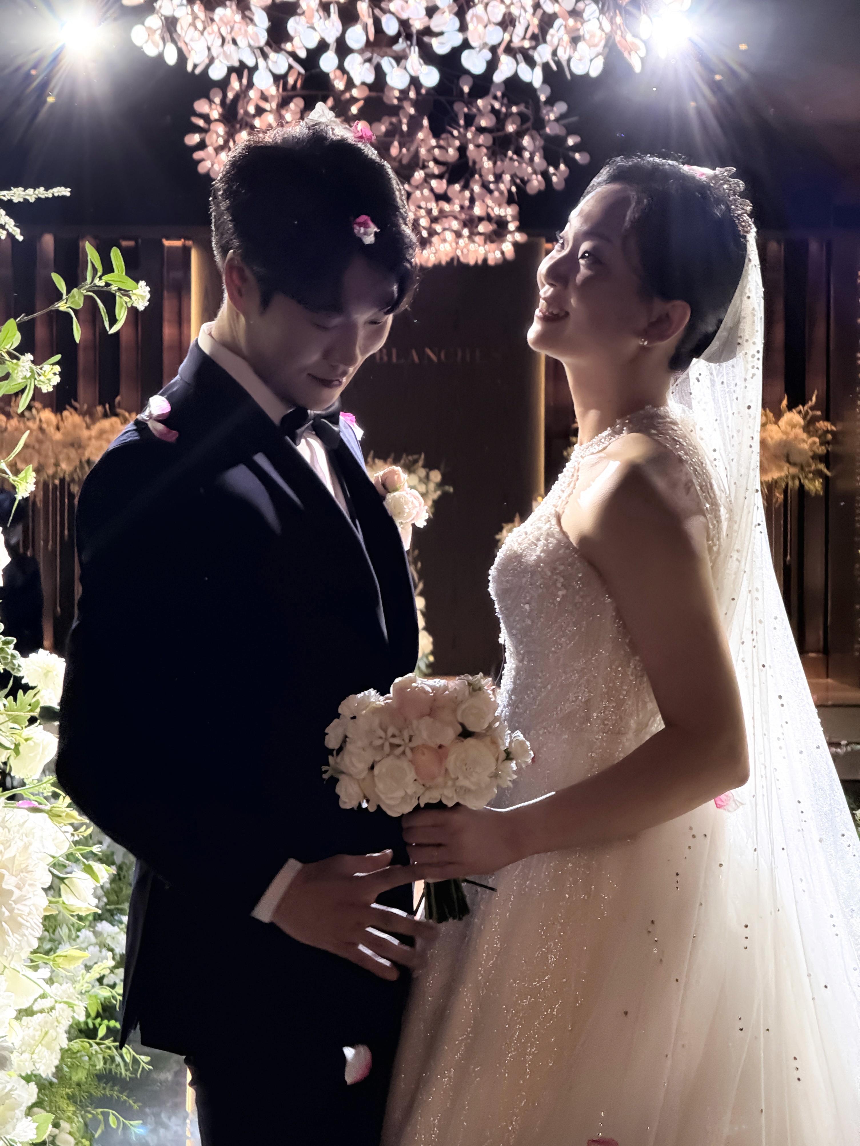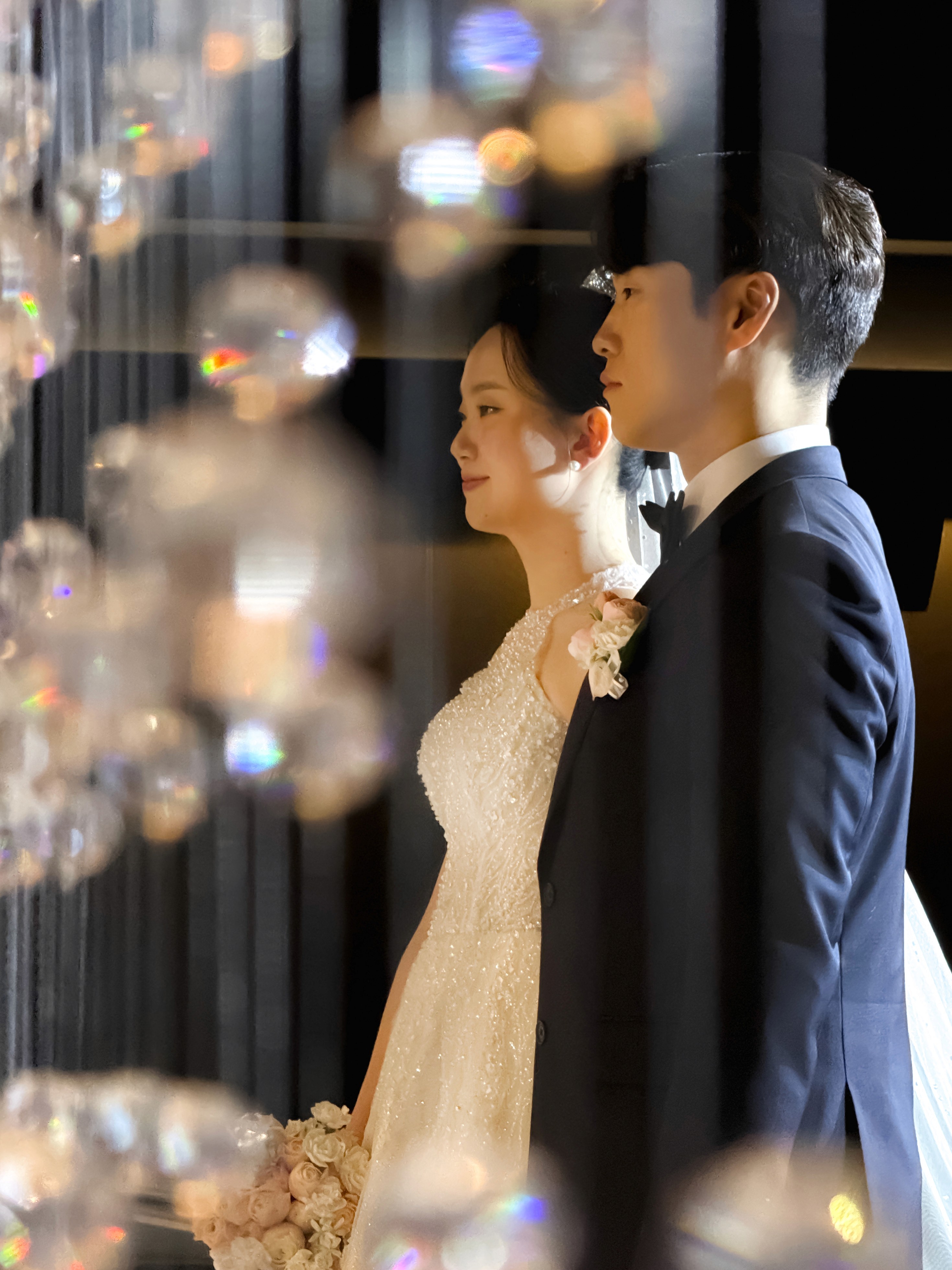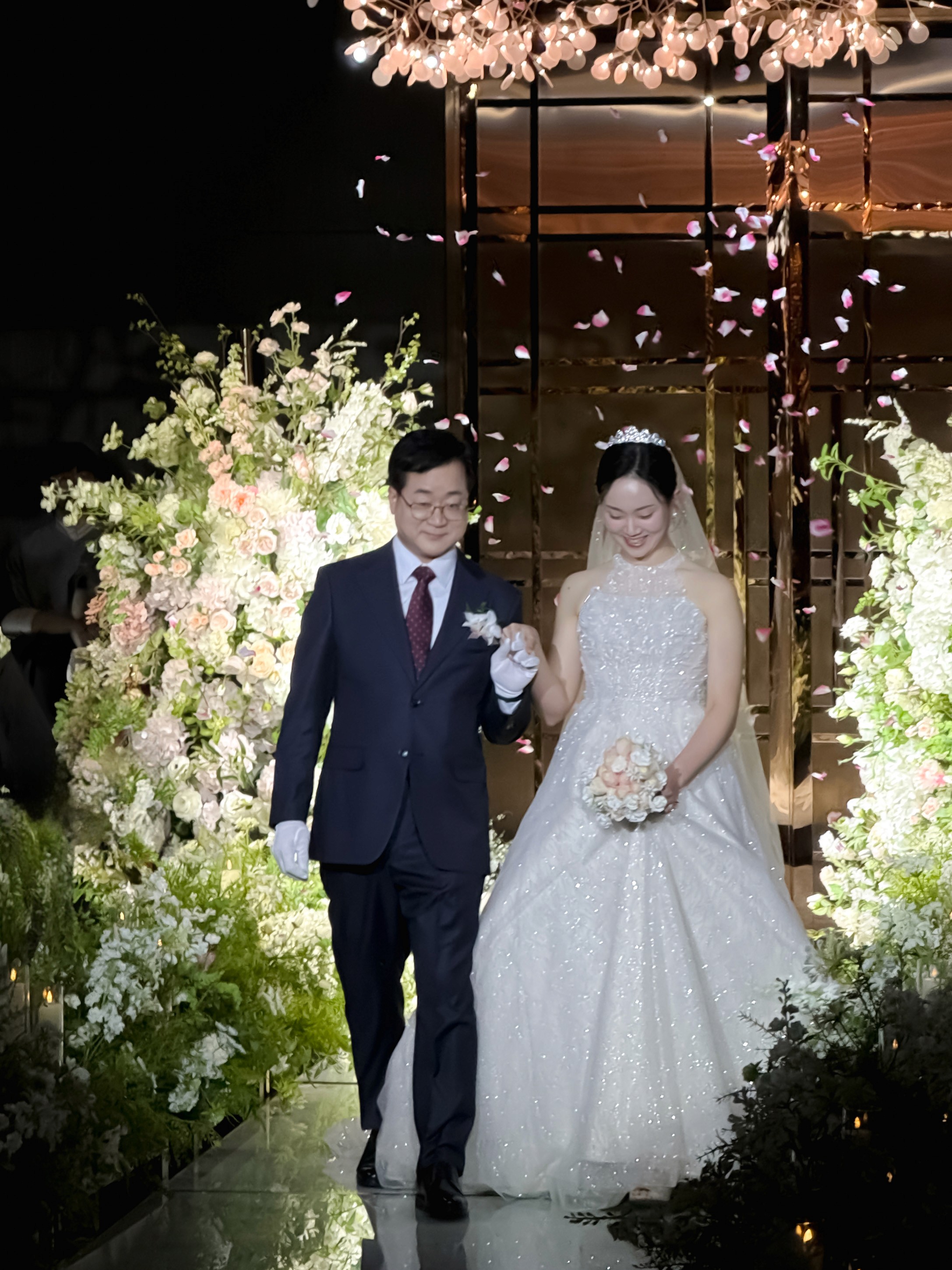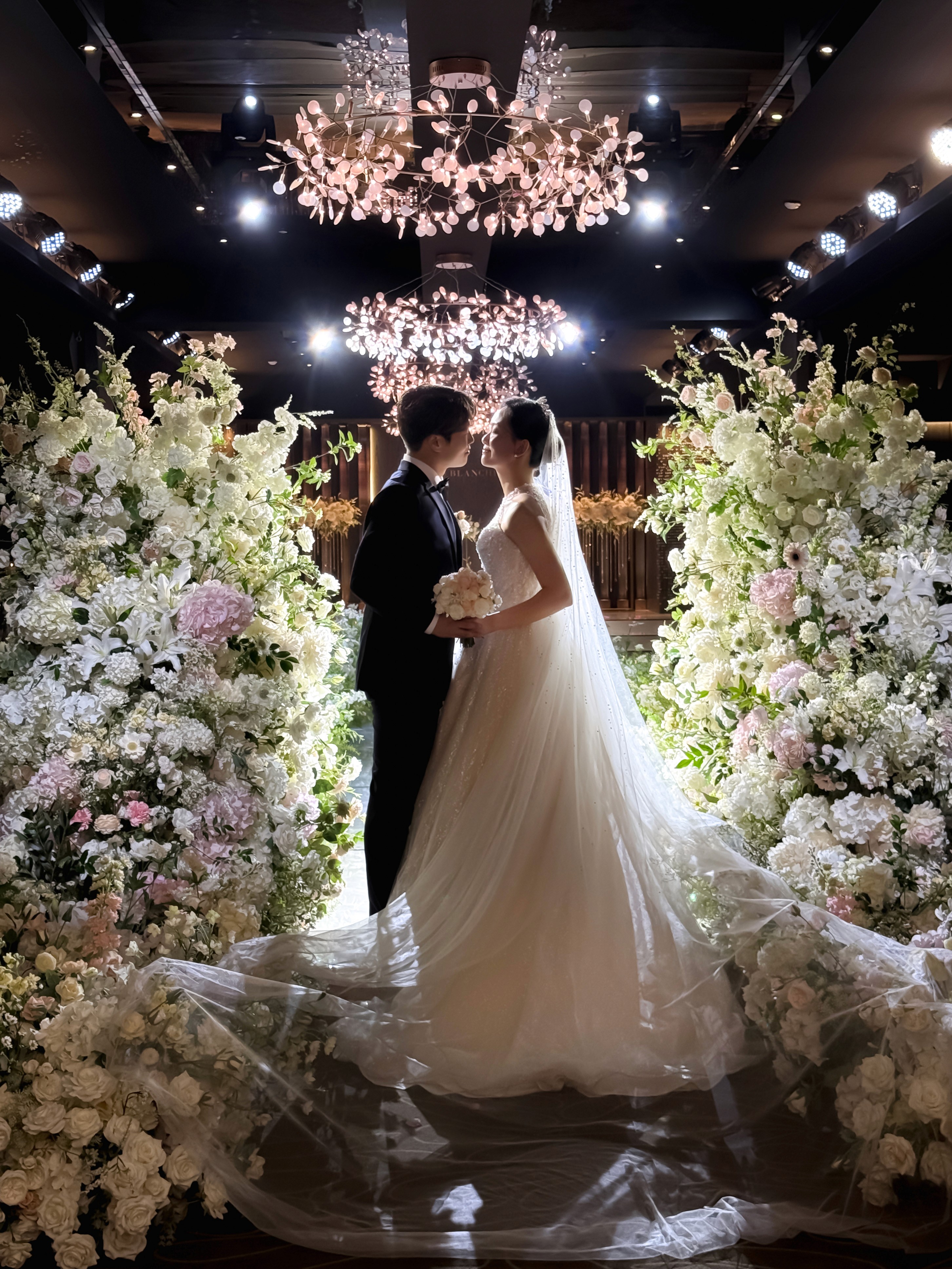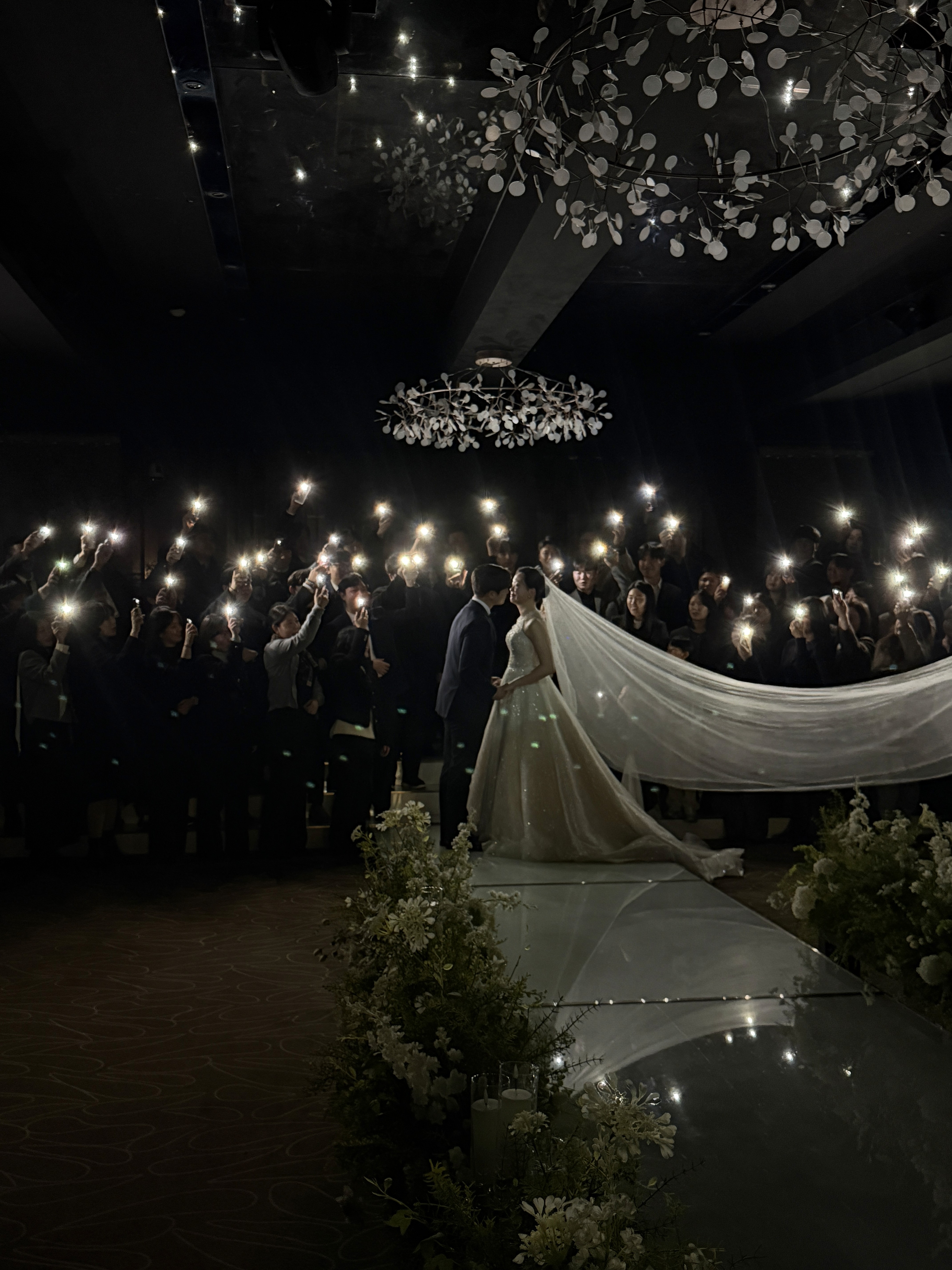 레노스블랑쉬의 시그니처 연출 중 하나는 단상 쪽에 떨어지는 은하수 느낌의 비즈 장식입니다. 온미스냅은 이 반짝이는 디테일을 배경으로 활용하여 예식 장면을 더욱 깊이 있고 분위기 있게 담아냈습니다. 안정적인 조명 밸런스 덕분에 아이폰 특유의 선명한 노출 제어가 빛을 발했던 순간입니다.
