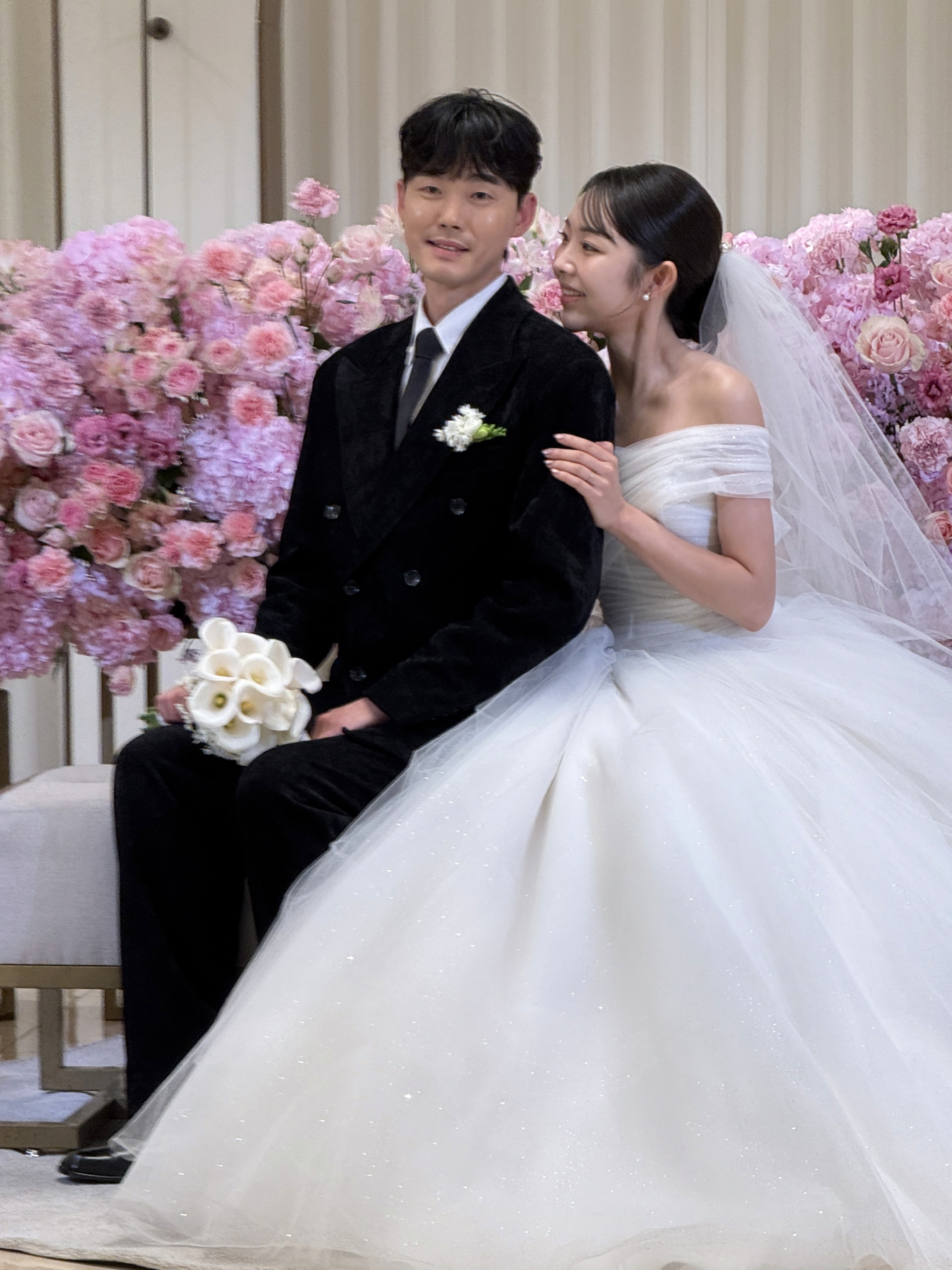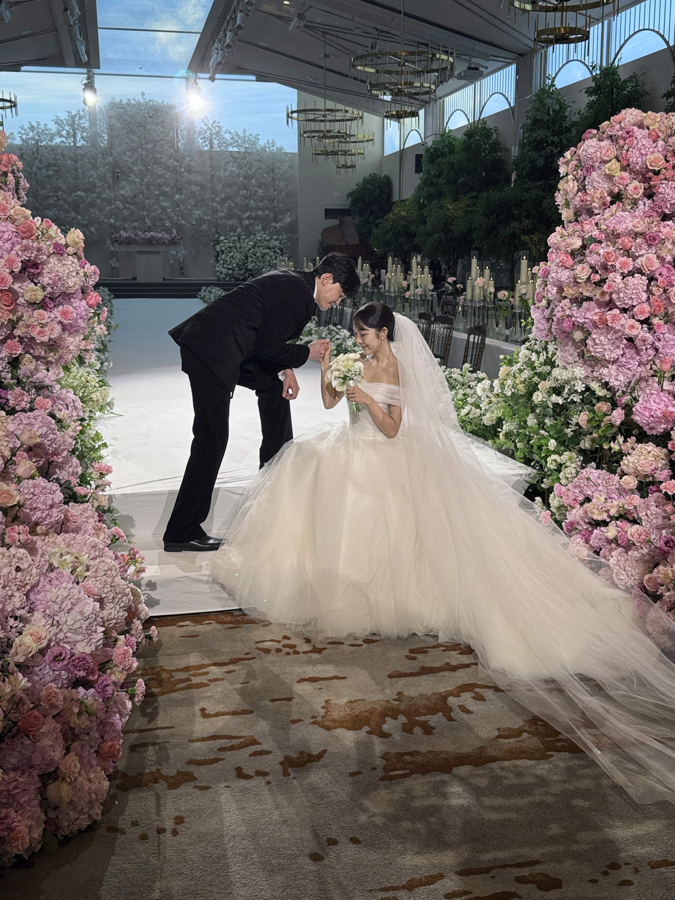핑크빛 꽃으로 둘러싸인 화사한 신부대기실