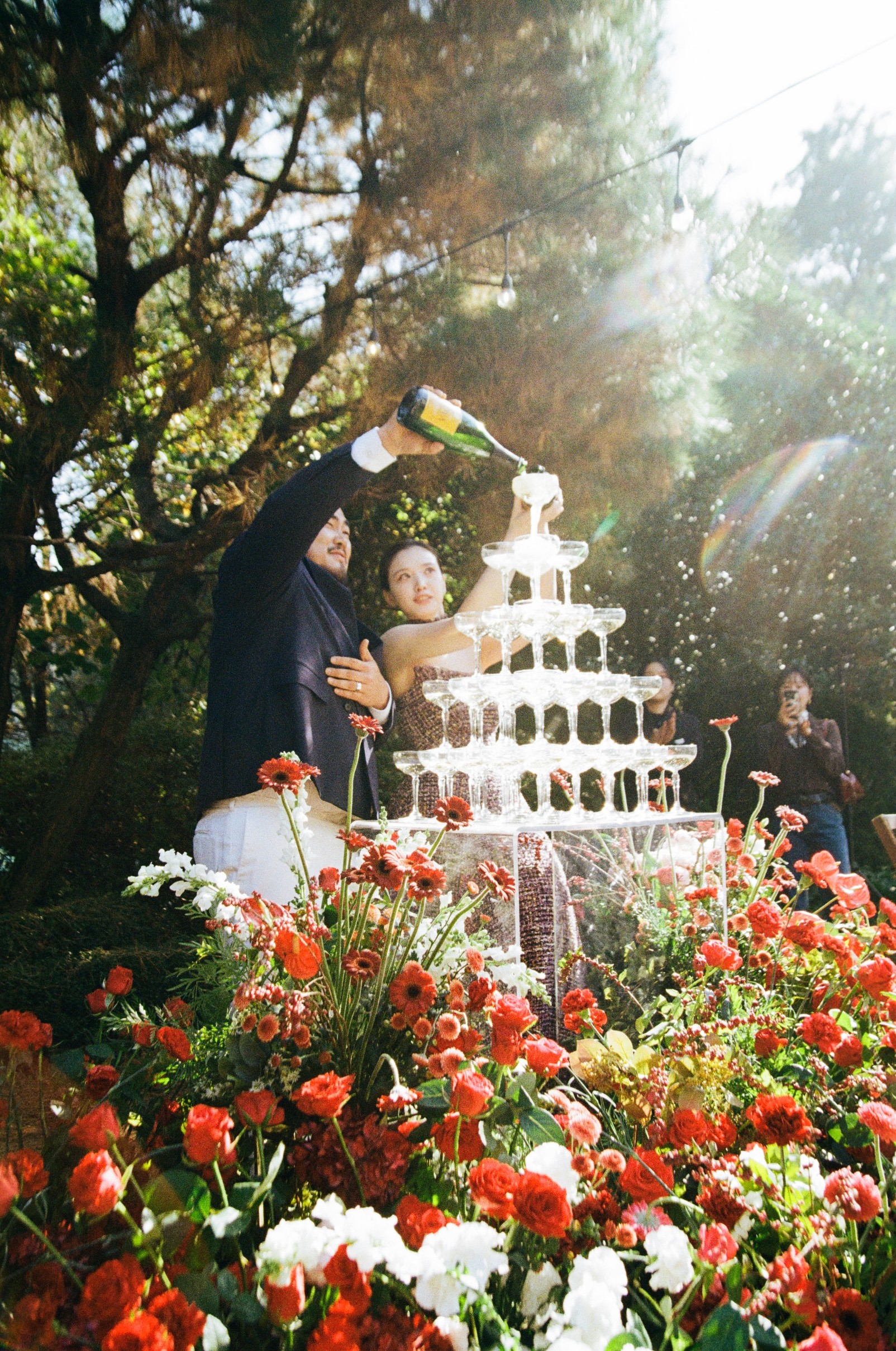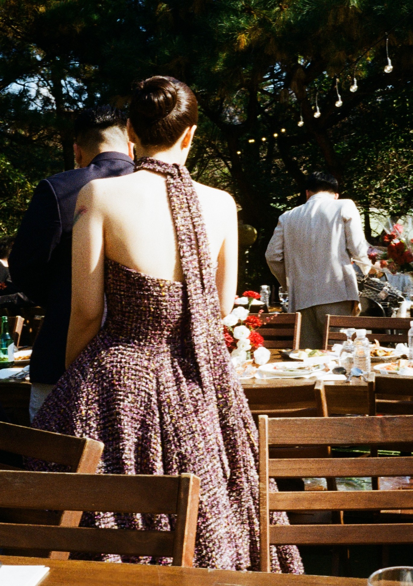 연회장은 내추럴한 나무 소재의 테이블과 의자, 그리고 풍성한 꽃 장식으로 꾸며져 있습니다. 마치 해외의 프라이빗한 가든 파티에 초대받은 듯한 기분을 느끼게 해주며, 이러한 무드는 살랑필름 특유의 따뜻하고 필름틱한 색감과 만나 더욱 깊은 감성을 자아냅니다.