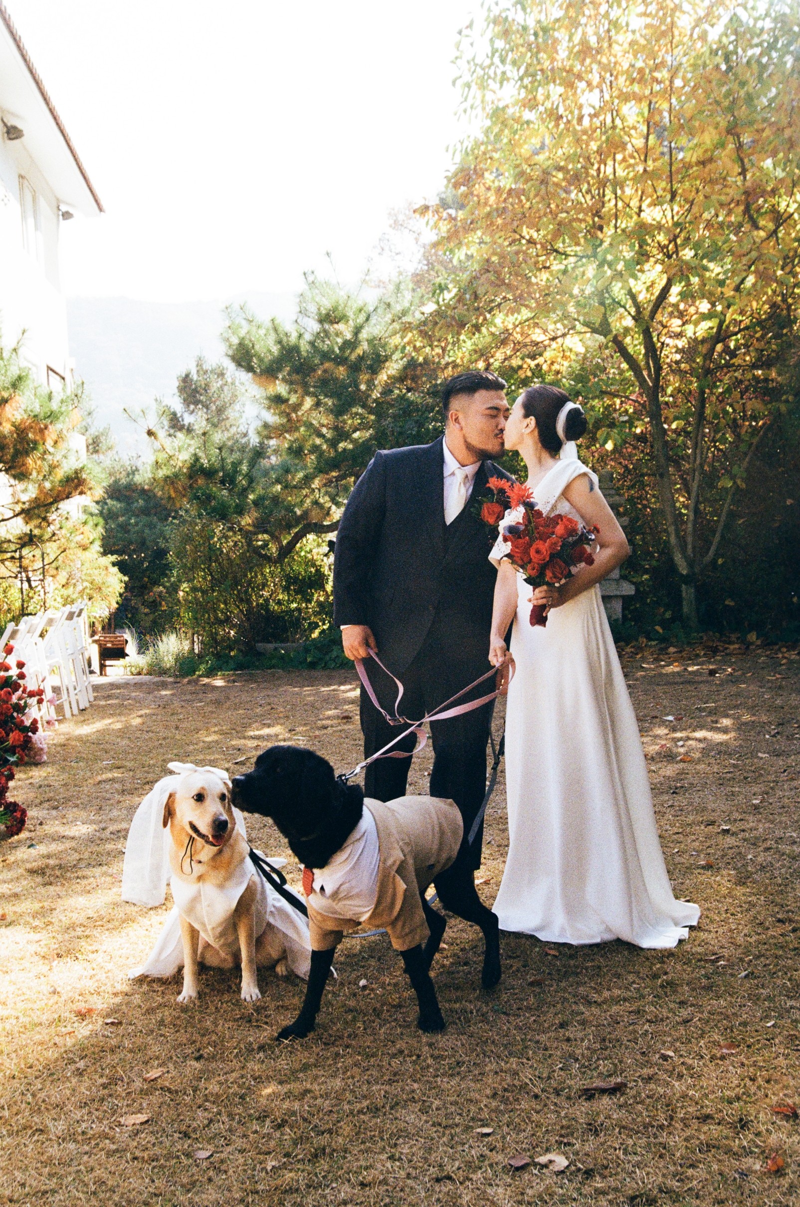 정숙하기만 한 예식보다는 두 분의 개성을 살린 힙한 포즈들이 앨범 곳곳을 채웠습니다. 특히 신랑 신부 예복을 맞춰 입은 귀여운 강아지 커플은 이날의 하이라이트였습니다. 하객들의 웃음이 끊이지 않았던 그 유쾌한 순간들을 살랑필름은 놓치지 않고 생동감 있게 포착했습니다. 억지스러운 연출이 아닌, 두 분이 가진 본연의 즐거움이 사진에 그대로 녹아들도록 담아냈습니다.