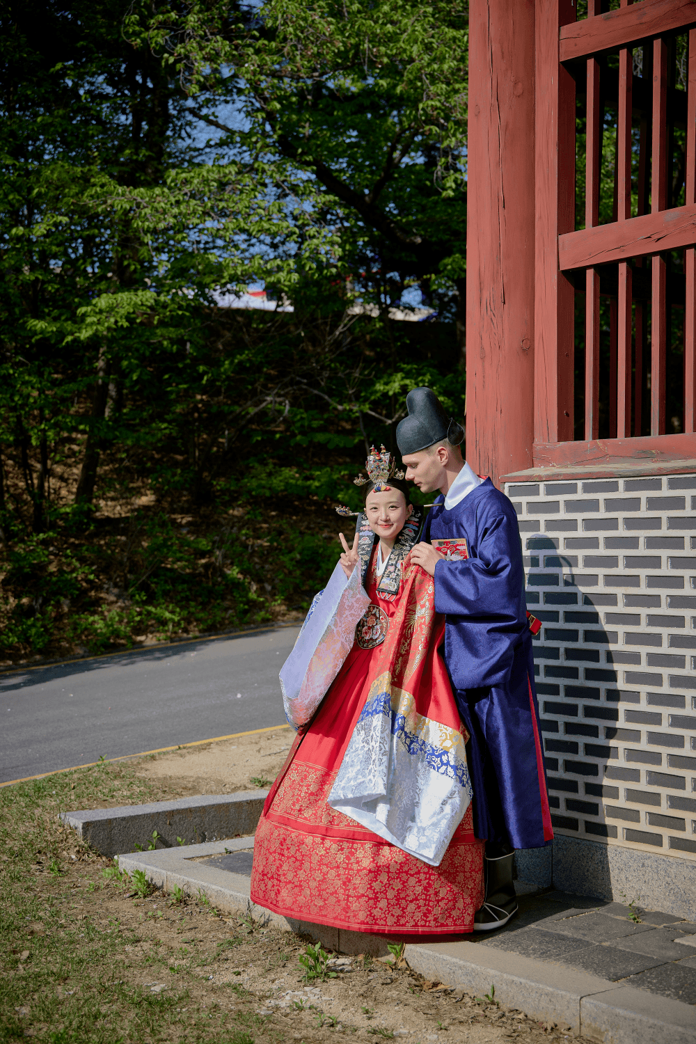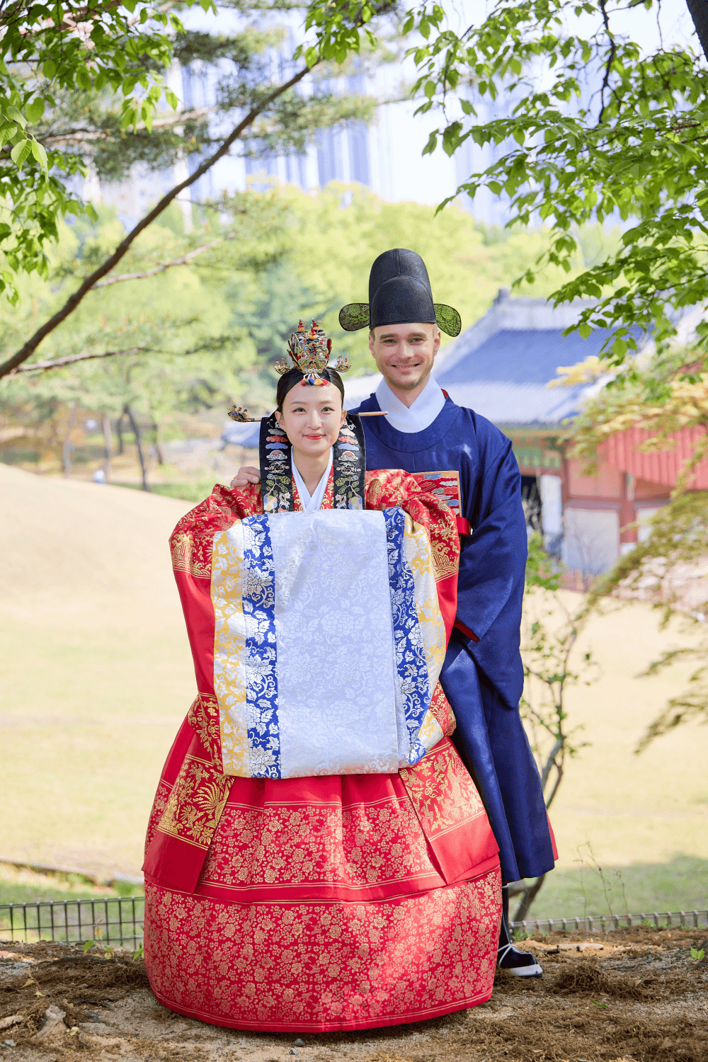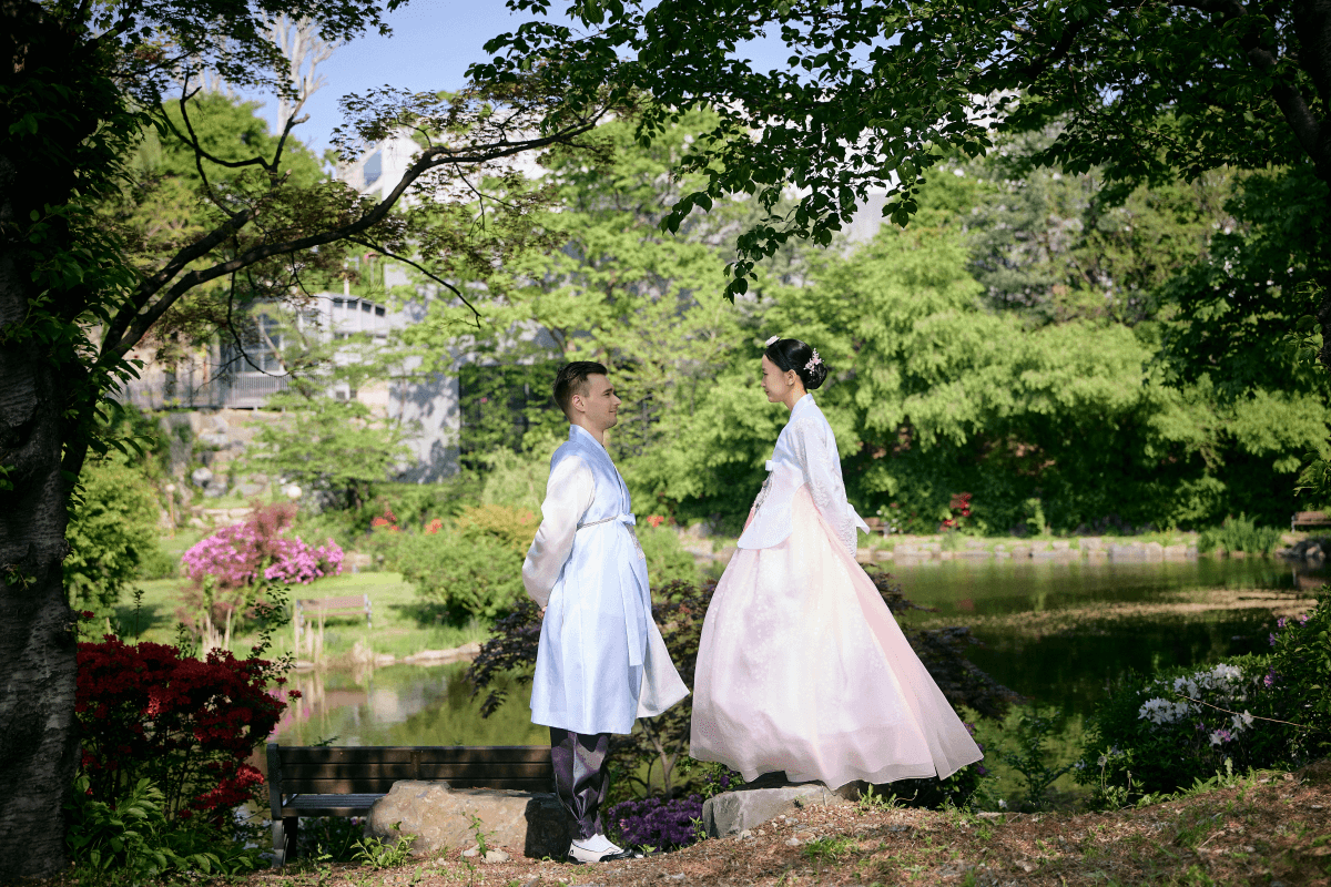 한복은 입는 과정이 생각보다 복잡하고 오래 걸립니다. 일반 한복에서 혼례복으로 갈아입는 데 소요되는 약 20~30분의 시간을 아낀다면, 그만큼 연못과 고궁 배경에서 두 분의 다정한 모습을 더 많이 기록할 수 있습니다. 촬영에 온전히 집중하고 싶으신 신부님들이라면 대례복 단독 촬영이 결과물의 풍성함 면에서 훨씬 유리합니다.