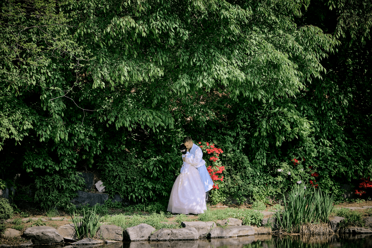 본식이 시작되기 전, 기념관 내 위치한 조용한 연못에서 두 분만의 프라이빗한 컨셉 촬영이 진행됩니다. 고즈넉한 풍경과 한복의 조화는 전통혼례 스냅에서만 느낄 수 있는 단아하고 기품 있는 미학을 완성해 줍니다.