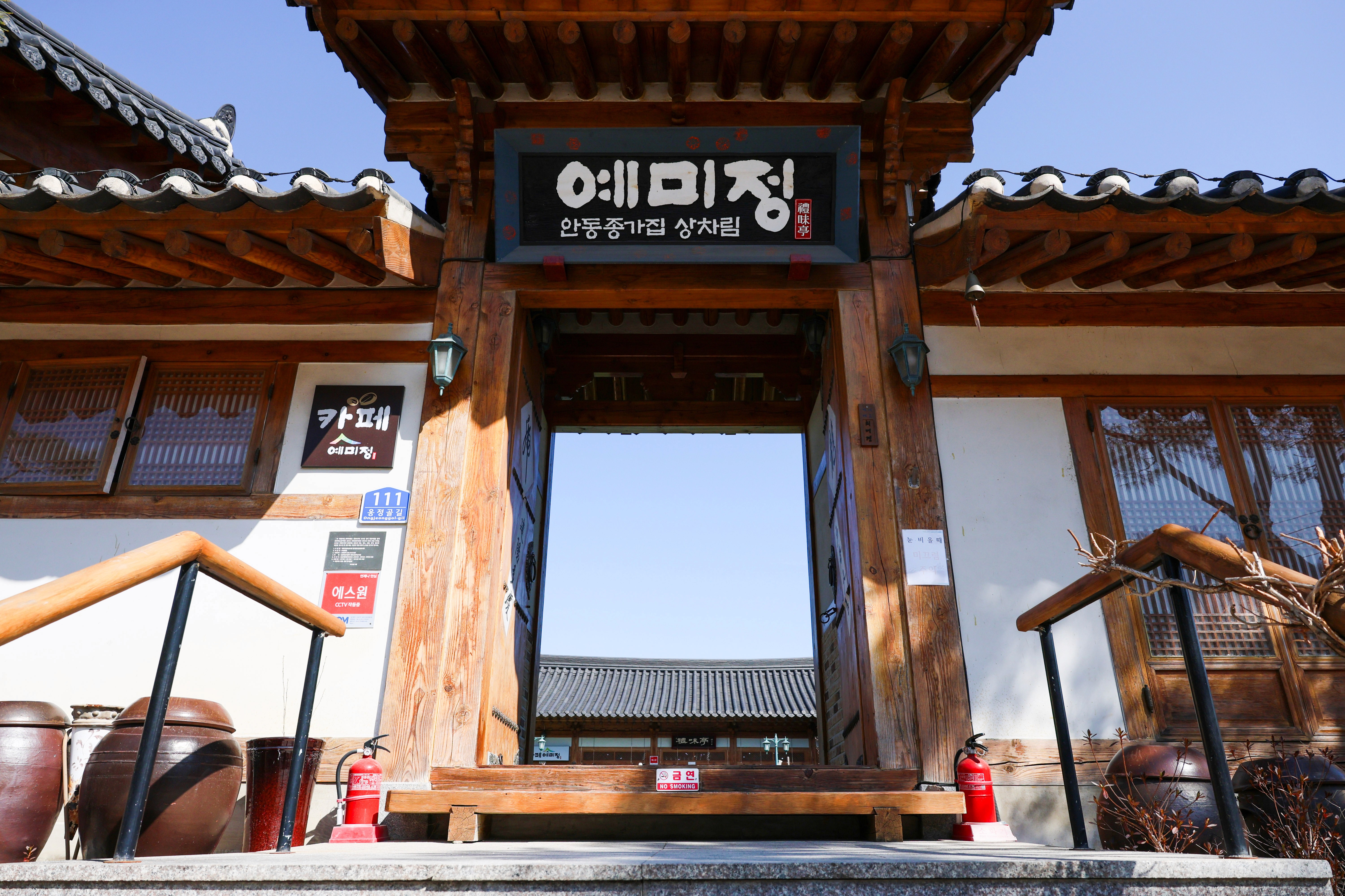 날씨가 맑은 날에는 예미정 2층 카페 마당에서의 야외 촬영을 강력 추천드립니다. 한옥의 지붕선과 고풍스러운 분위기가 가장 잘 살아나는 장소로, 특히 한복을 입었을 때 그 매력이 배가되는 인기 촬영 포인트입니다.