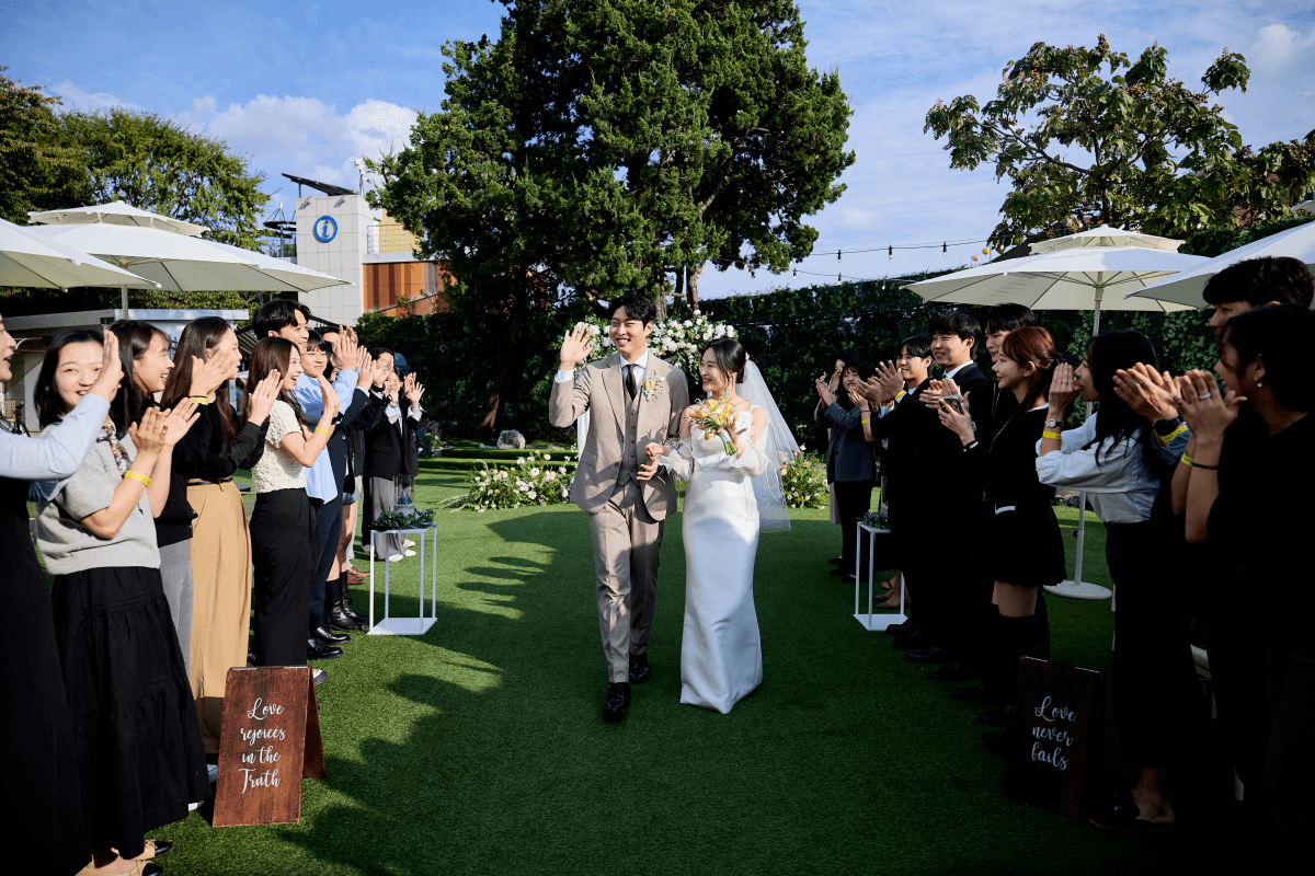 이곳의 가장 큰 특징 중 하나는 신부대기실이 야외에 위치해 있다는 점입니다. 닫힌 공간이 아닌 탁 트인 가든에서 하객들을 맞이하기 때문에, 신부님은 한결 편안하고 자연스러운 분위기 속에서 인사를 나누실 수 있습니다. 디어데이스냅은 이 열린 공간을 활용해 하객들과 소통하는 신부님의 환한 미소를 다채로운 화각으로 기록합니다.