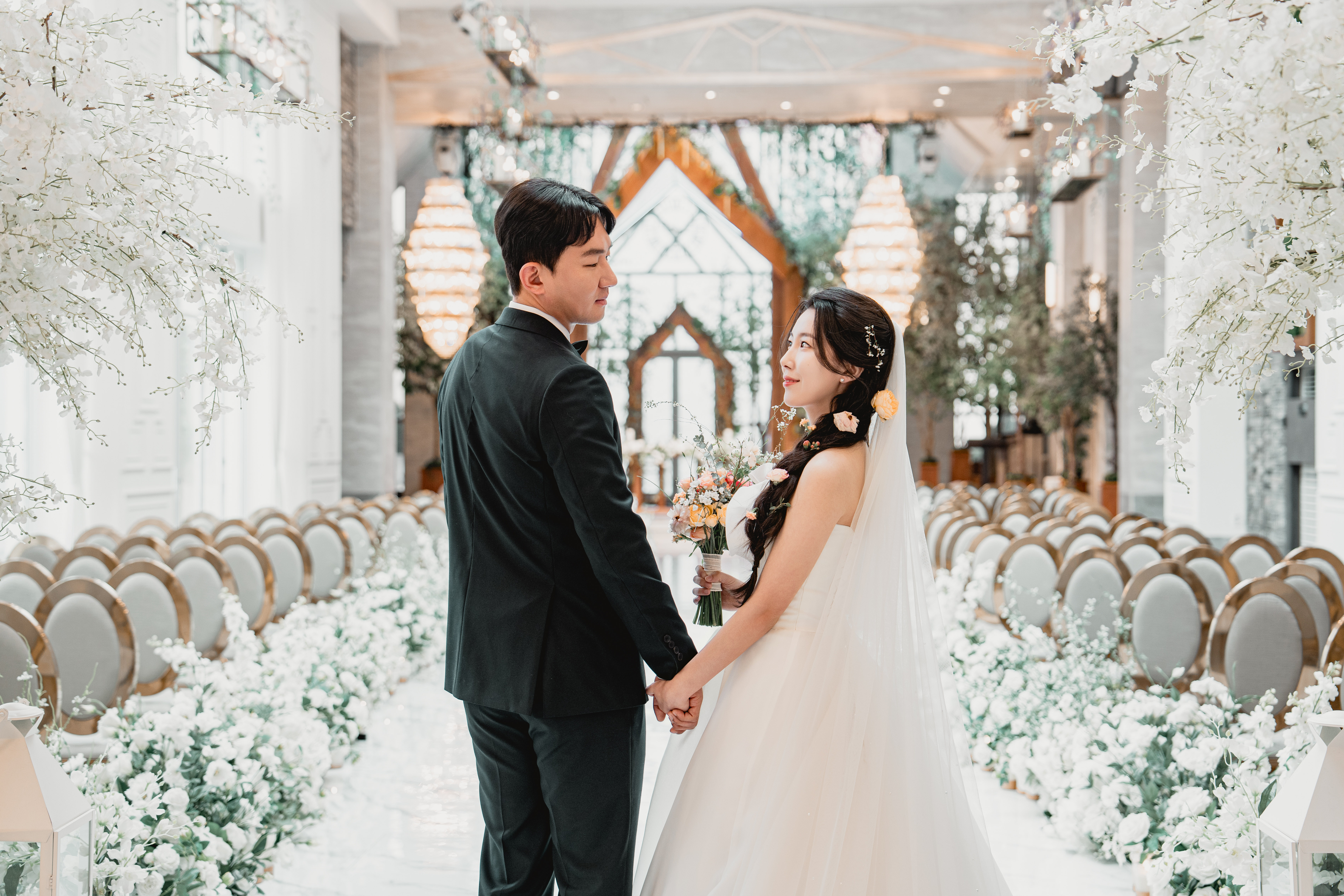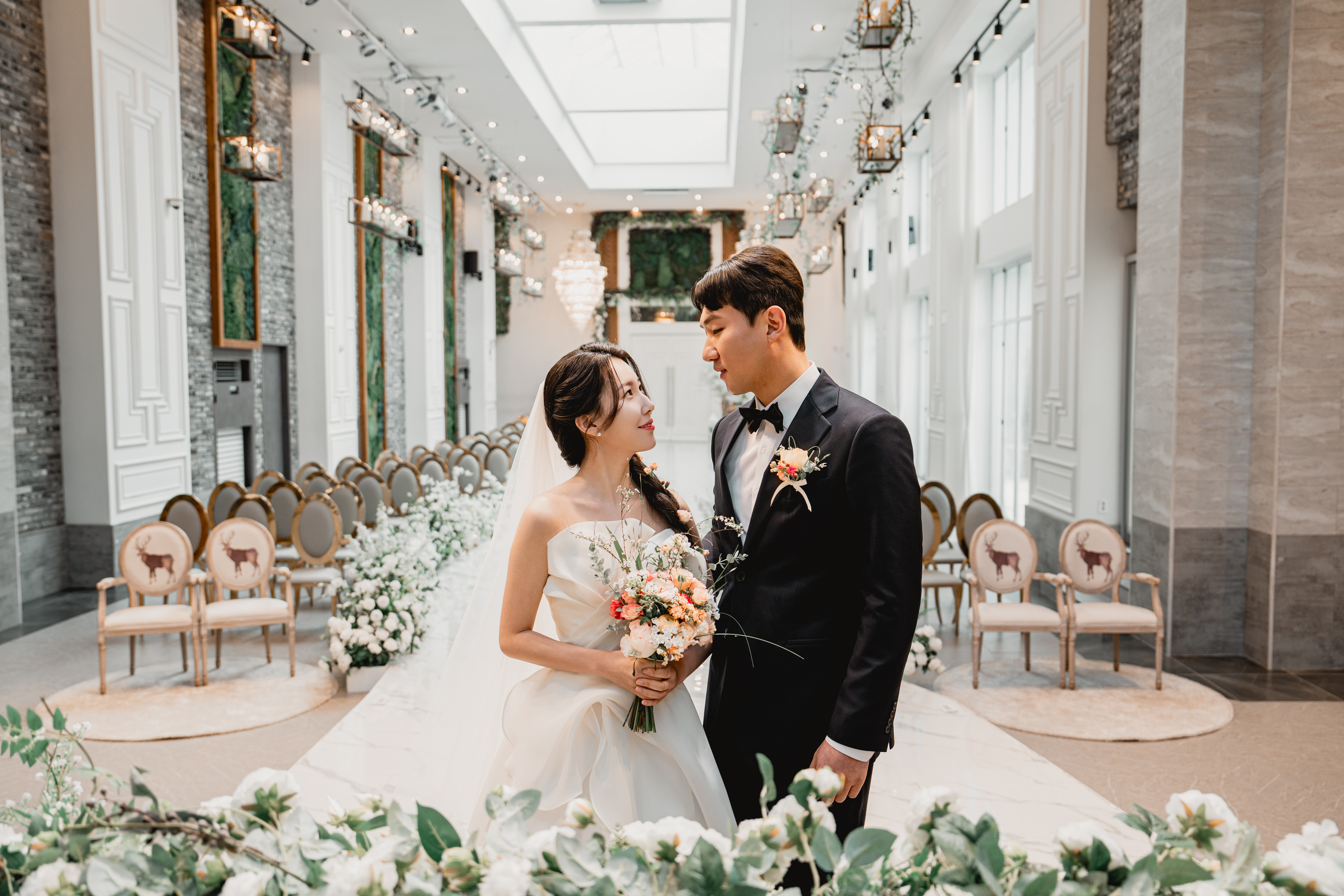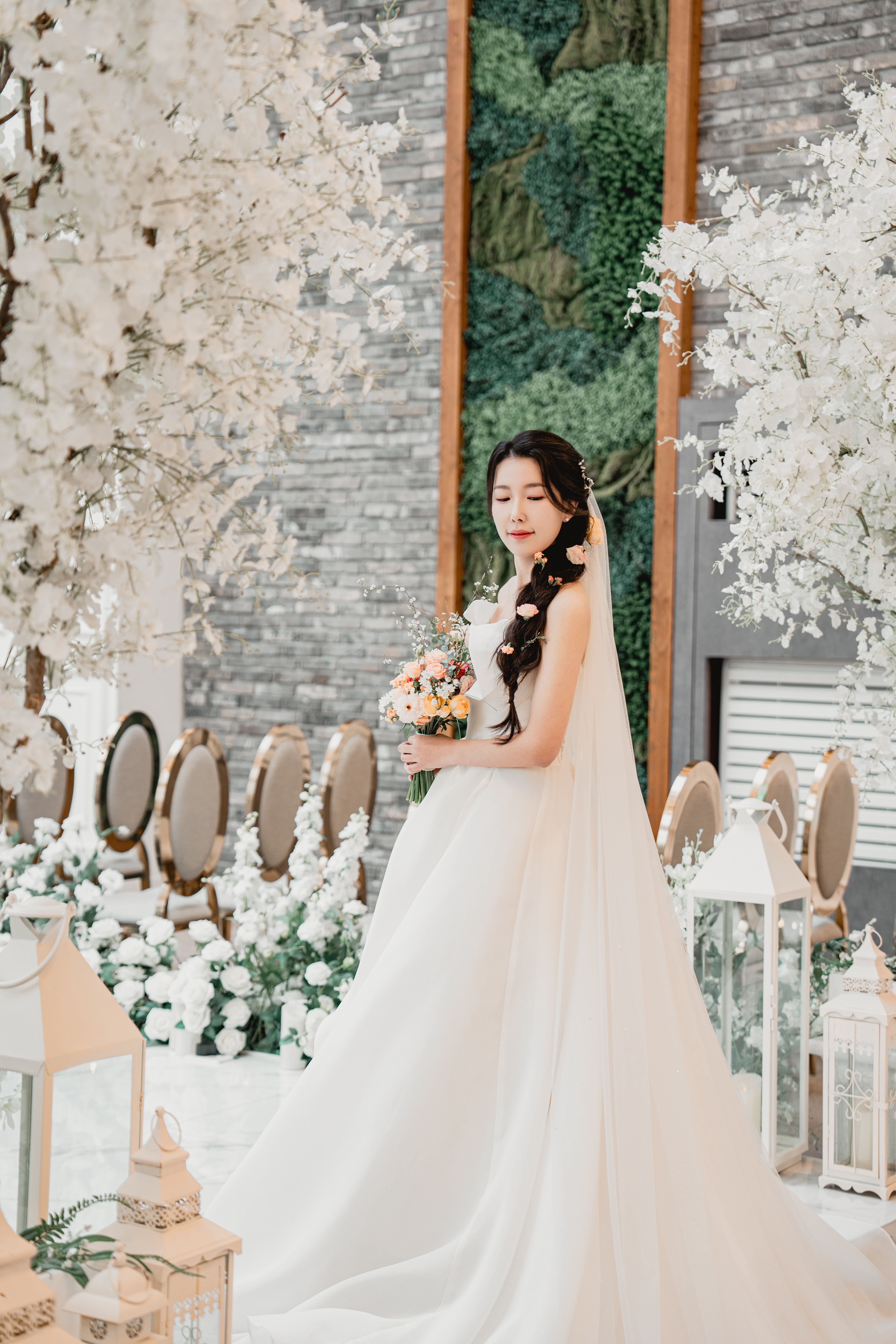 전체적으로 깔끔한 화이트 톤 인테리어에 풍성한 초록 잎과 꽃들이 어우러진 플랜테리어가 특징입니다. 인위적인 느낌보다는 생기 있고 자연스러운 숲속 예식의 느낌을 주어, 내추럴한 감성을 선호하는 신부님들께 인기가 높습니다.