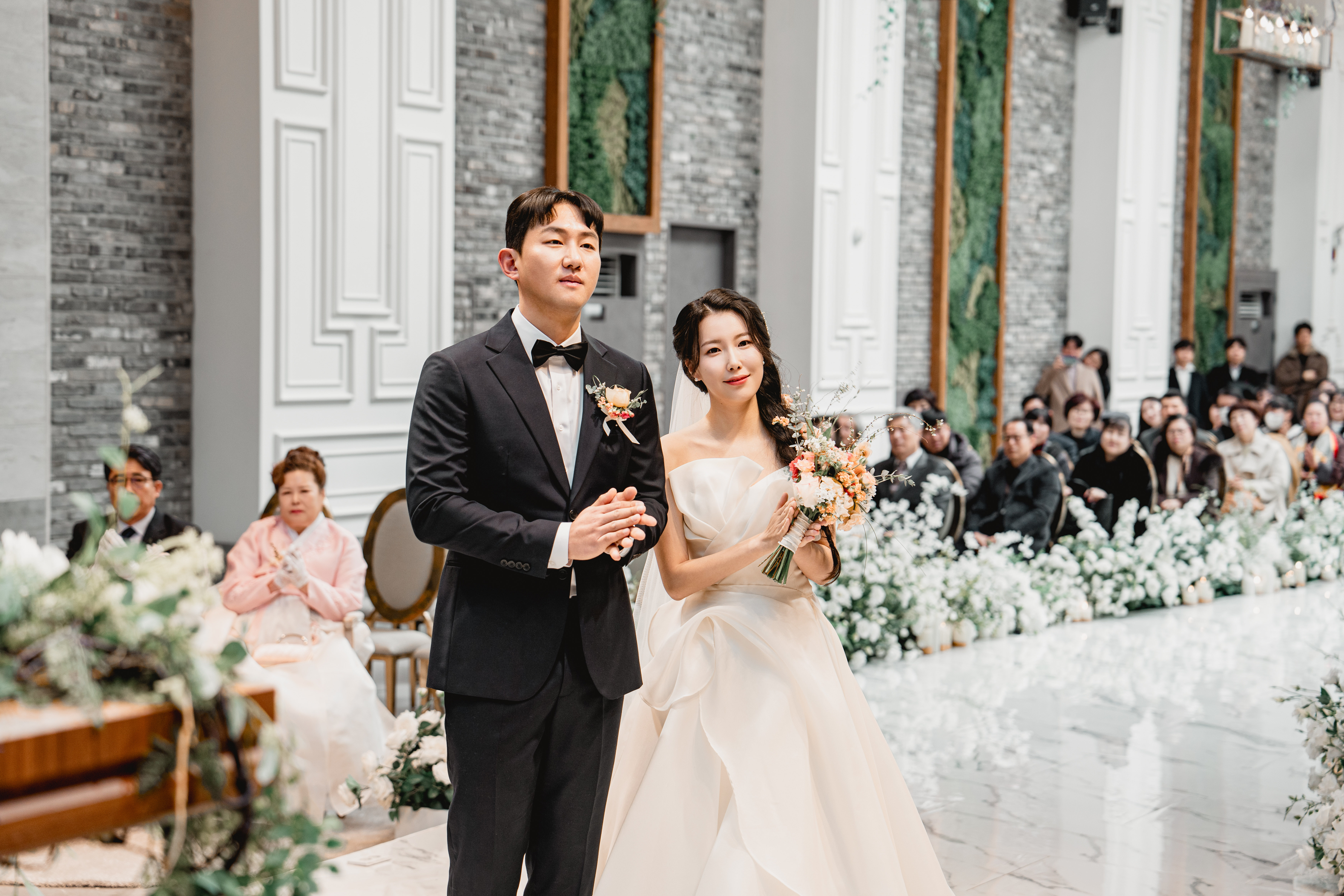 밝은 홀의 가장 큰 장점은 입퇴장 시 강한 핀조명의 영향을 덜 받는다는 것입니다. 조명이 인물을 때리는 강한 대비가 적어, 신랑 신부님의 피부 톤이 훨씬 부드럽고 맑게 표현됩니다. 기우사진은 이 자연스러운 채광 무드를 살려 화사하고 생동감 넘치는 컷들을 남겨드립니다.