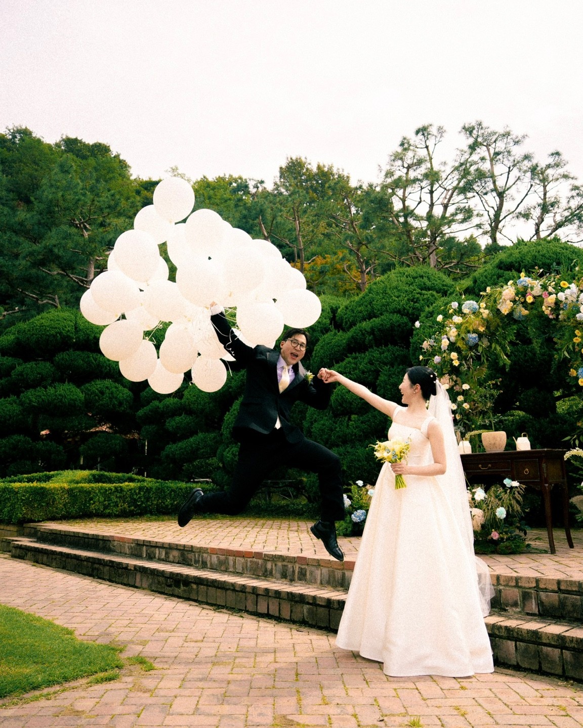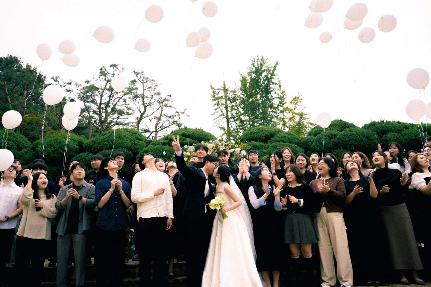 예식의 마지막, 혹은 원판 촬영 시 이 헬륨 풍선을 활용하면 평생 잊지 못할 인생샷이 완성됩니다. 하객들이 다 함께 풍선을 하늘로 날려 보내거나, 친구들과 풍선을 들고 찍는 단체 컷은 야외 웨딩만의 화사함을 극대화해 줍니다. 나참기대스냅은 풍선이 하늘로 퍼져 나가는 찰나의 순간과 두 분의 환희를 놓치지 않고 입체적으로 담아냅니다.