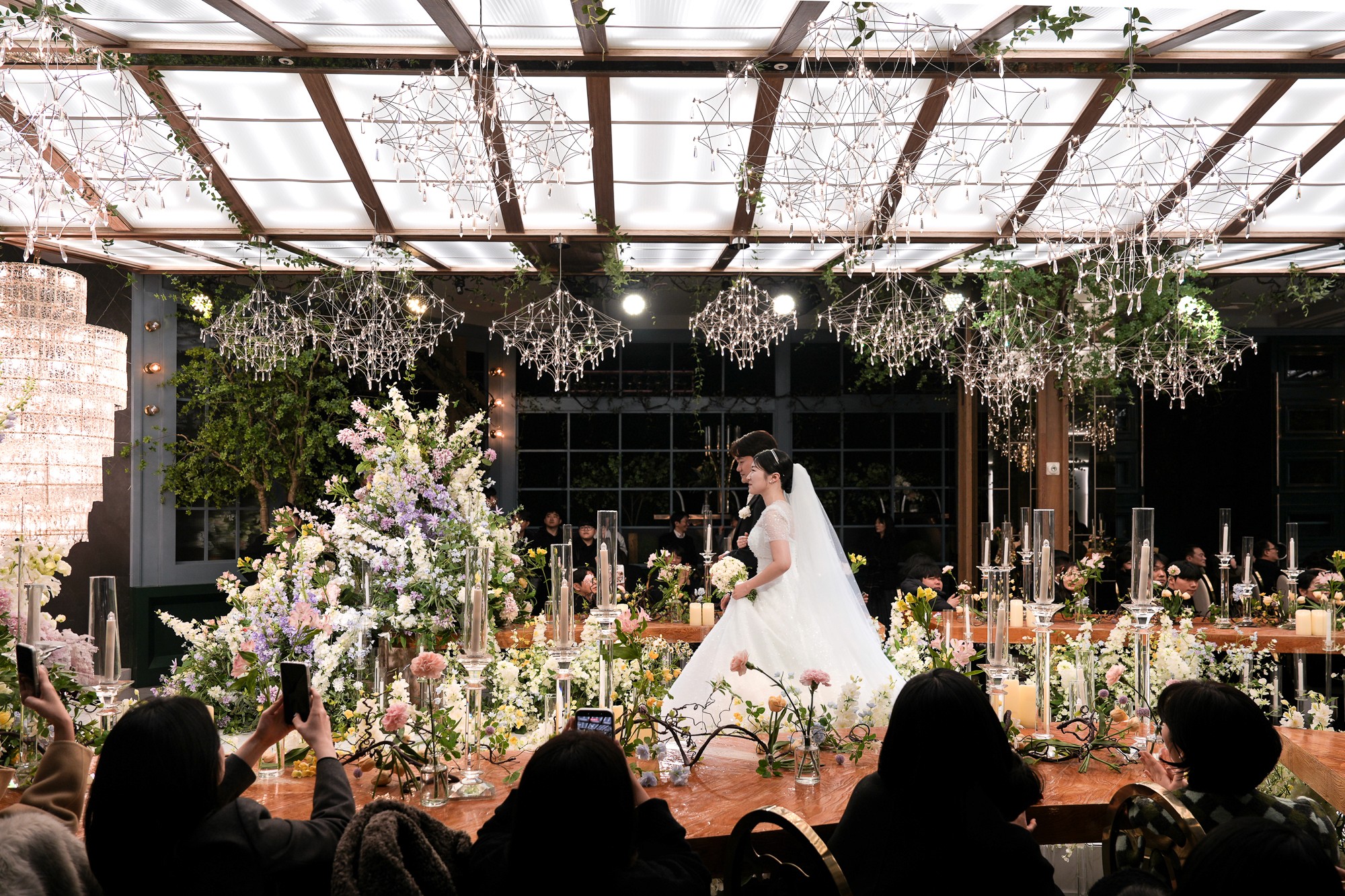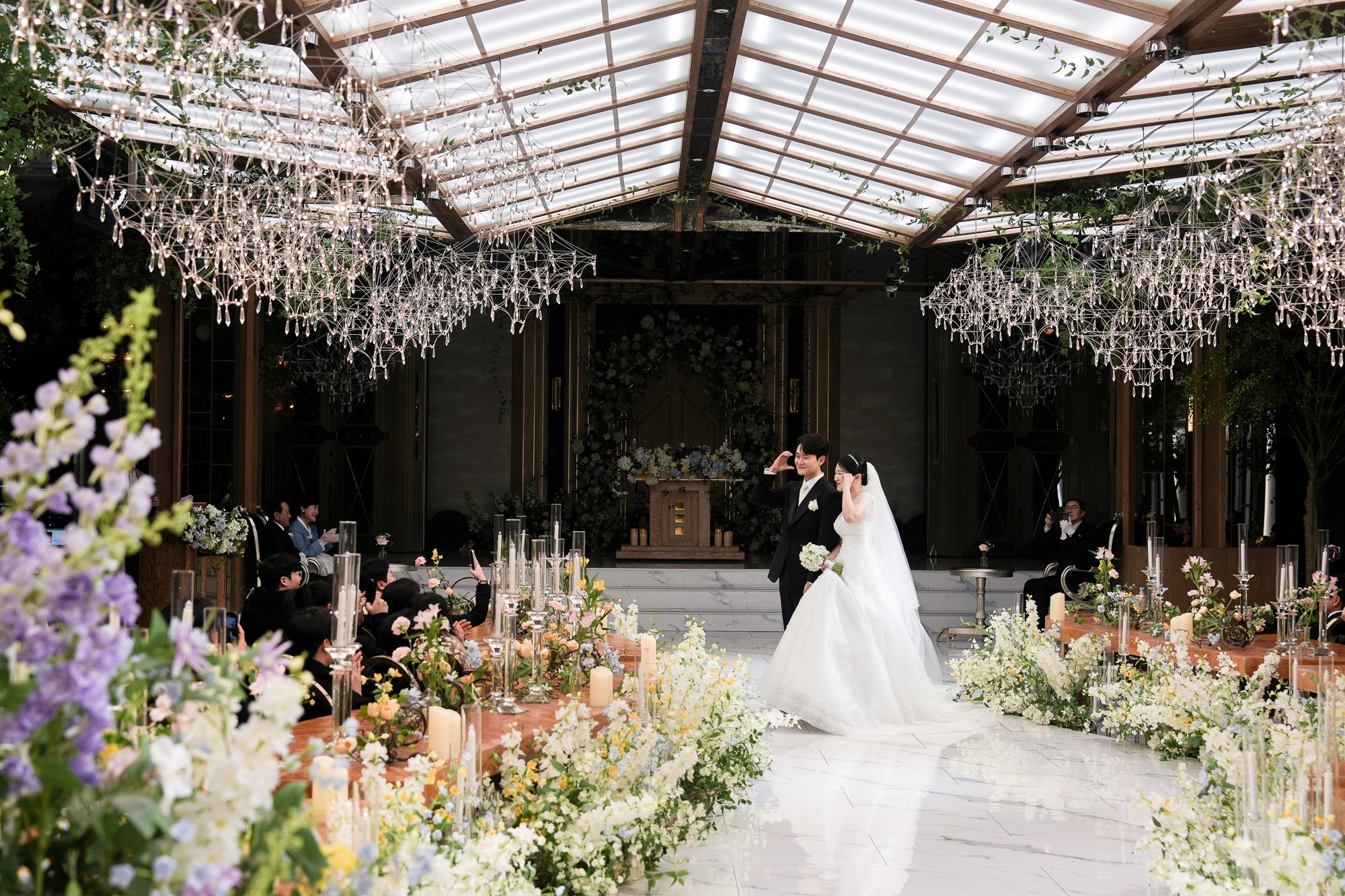 긴 버진로드는 신랑 신부님이 하객들의 축복을 받으며 행진하는 장면을 더욱 드라마틱하게 만들어줍니다. 행진 중 담기는 다양한 각도의 컷들은 본식 앨범의 하이라이트가 되기에 충분합니다.