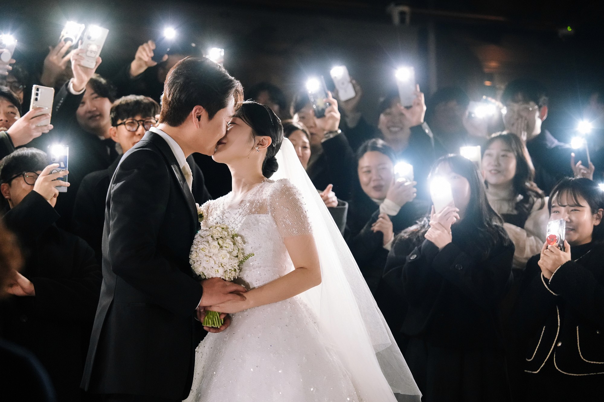 따뜻한 웜톤의 스폿 조명이 집중되는 광명역사컨벤션의 특성을 활용하여, 인물의 실루엣이 또렷하게 살아나는 결과물을 만듭니다. 조명 방향에 따른 그림자의 흐름까지 계산하여 공간의 입체감을 사진에 녹여냅니다.