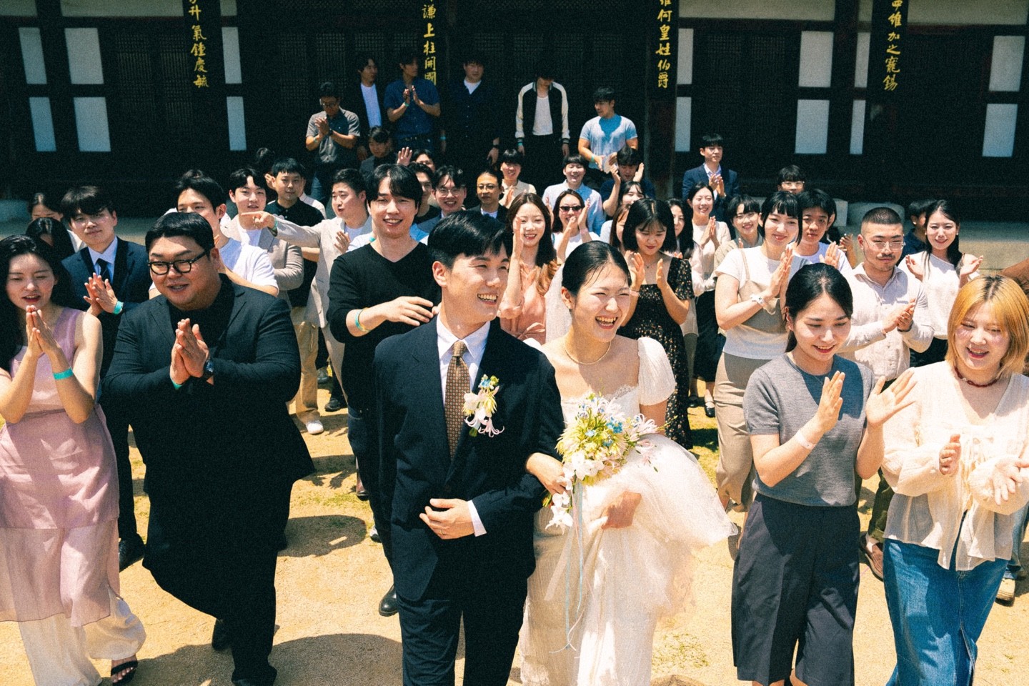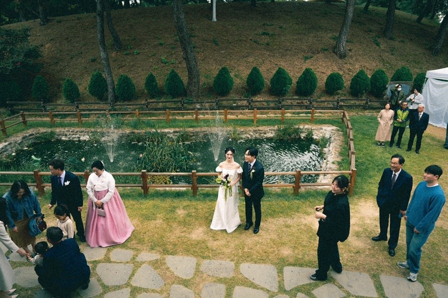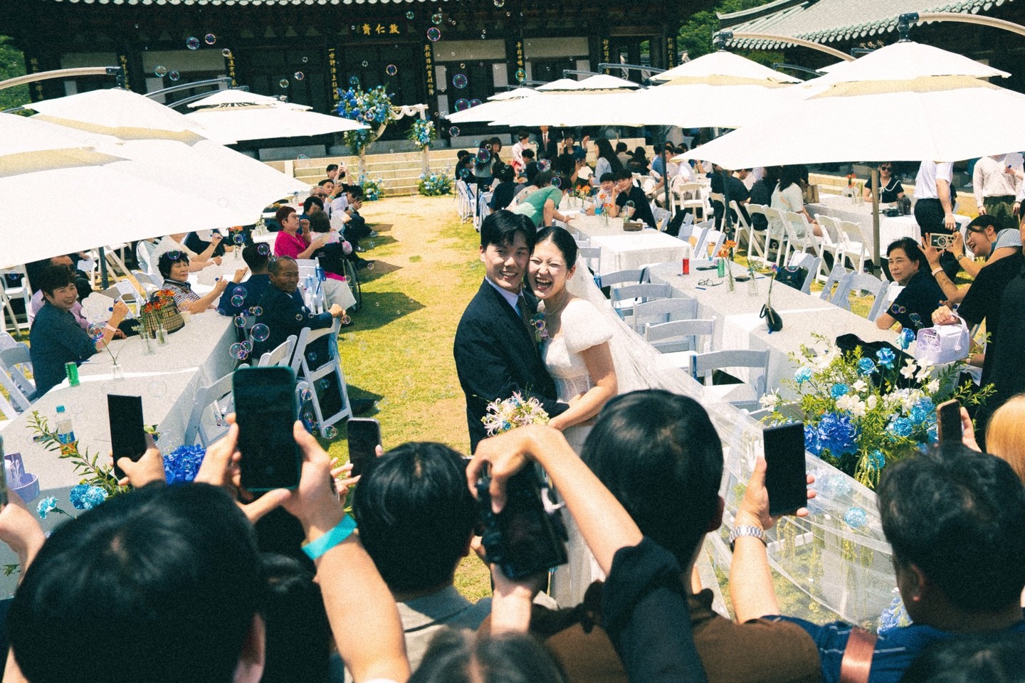 입장과 퇴장, 축가 순간에 퍼지는 비눗방울은 한옥 배경과 어우러져 환상적인 분위기를 자아냅니다. 여기에 원인재 대표님이 직접 진행해주시는 드론 촬영이 더해지면 상공에서 본 한옥 예식의 장관을 영상과 사진으로 남길 수 있습니다.
